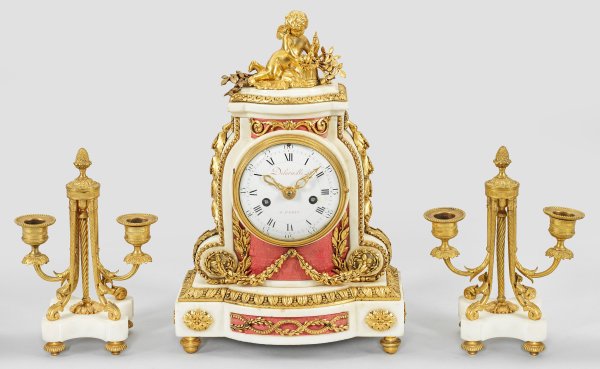 3-tlg.; Weißer Marmor und vergoldete Bronze. Über querrechteckig angelegtem, in der Front ausgebogtem Sockel mit Palmettenfries geschweift ansteigendes Uhrengehäuse mit Puttenbekrönung. Verglastes, unw. besch. Emailzifferblatt bez. Delaruelle à Paris. Pendulenwerk mit Fadenaufhängung sowie Halbstundenschlag auf Glocke. 2-flg. Girandolen mit geschwungenen Leuchterarmen. Uhren-H. 35 cm.