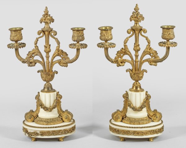 2-flg.; Bronze und weißer Marmor. Über Ovalsockel mit eingelegtem Fries aus eingerollten Blattranken kannelierter Säulenschaft flankiert von eingerollten Voluten. Oberhalb stark geschwungene Leuchterarme mit vasenförmigen Tüllen. Besch.; H. 36,5 cm.
