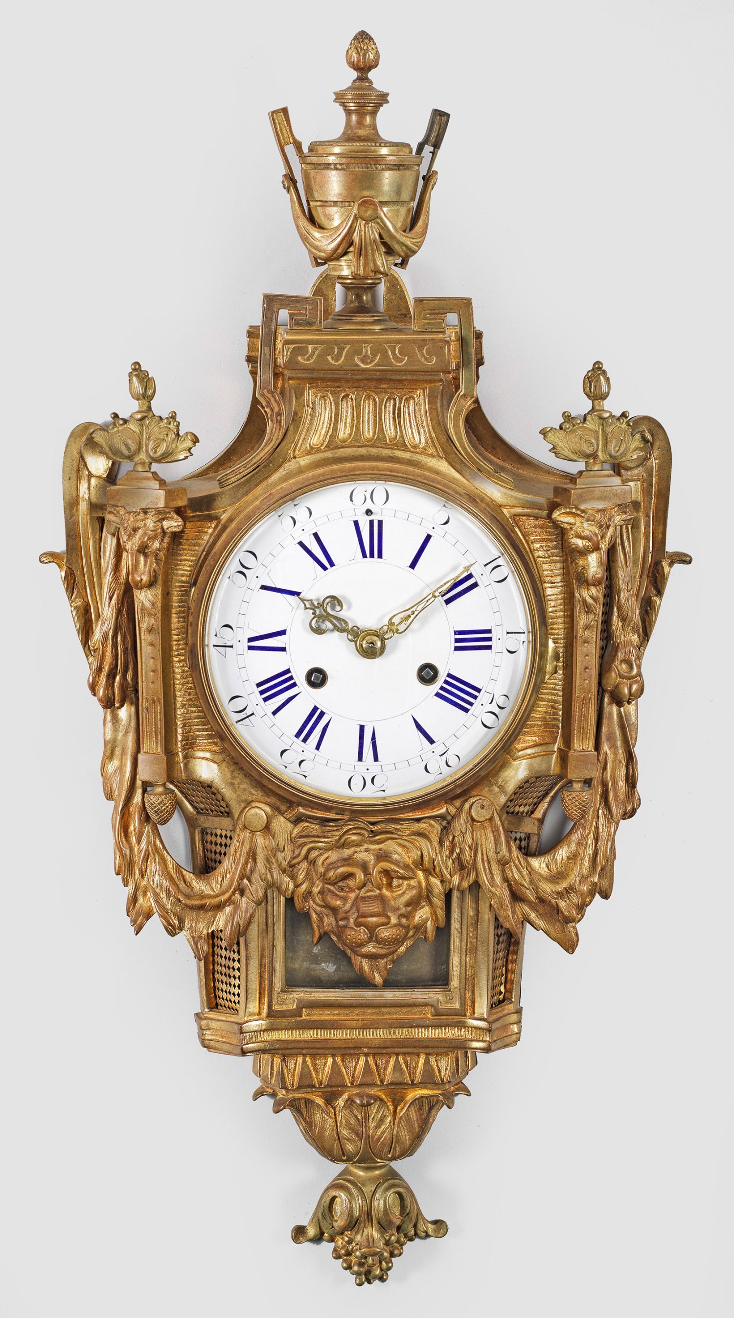 Bronze, vergoldet. Balusterförmiger Korpus, flankiert von Pilastern mit plastischen Widderköpfen, verbunden durch üppige Festons. Oberhalb große Vasenbekrönung. Verglastes Emailzifferblatt. Pendulenwerk mit Pendelfeder sowie Schlagwerk auf Glocke. H. 74 cm.