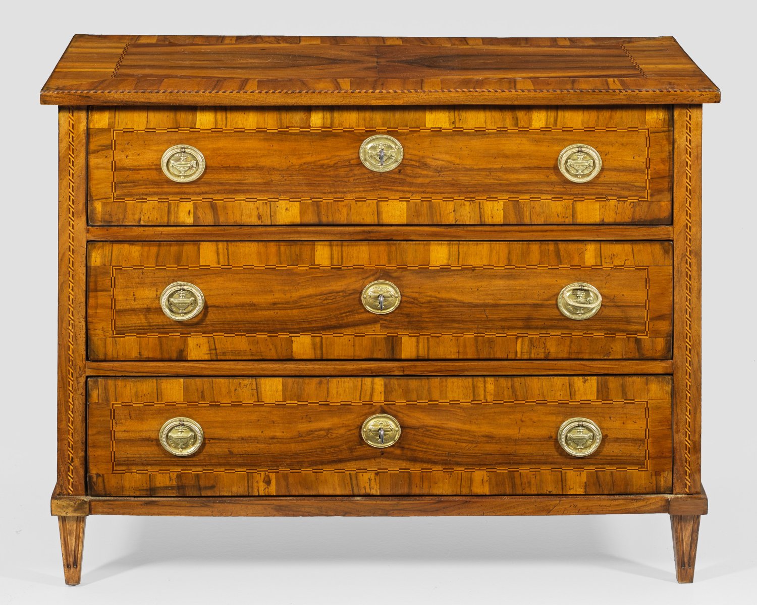 Nussbaum, furniert sowie Einlagen aus Pflaumenholz und Ahorn. Gerader, querrechteckig angelegter Korpus auf schmaler Zarge und konischen Vierkantbeinen. In der gegliederten Front drei breite Schubladen. Gering überstehende Deckplatte. Flächendeckend breit gerahmte Furnierfelder, von ornamental gestalteten Bandeinlagen begrenzt. H. 81 cm. 109 cm x 56 cm.