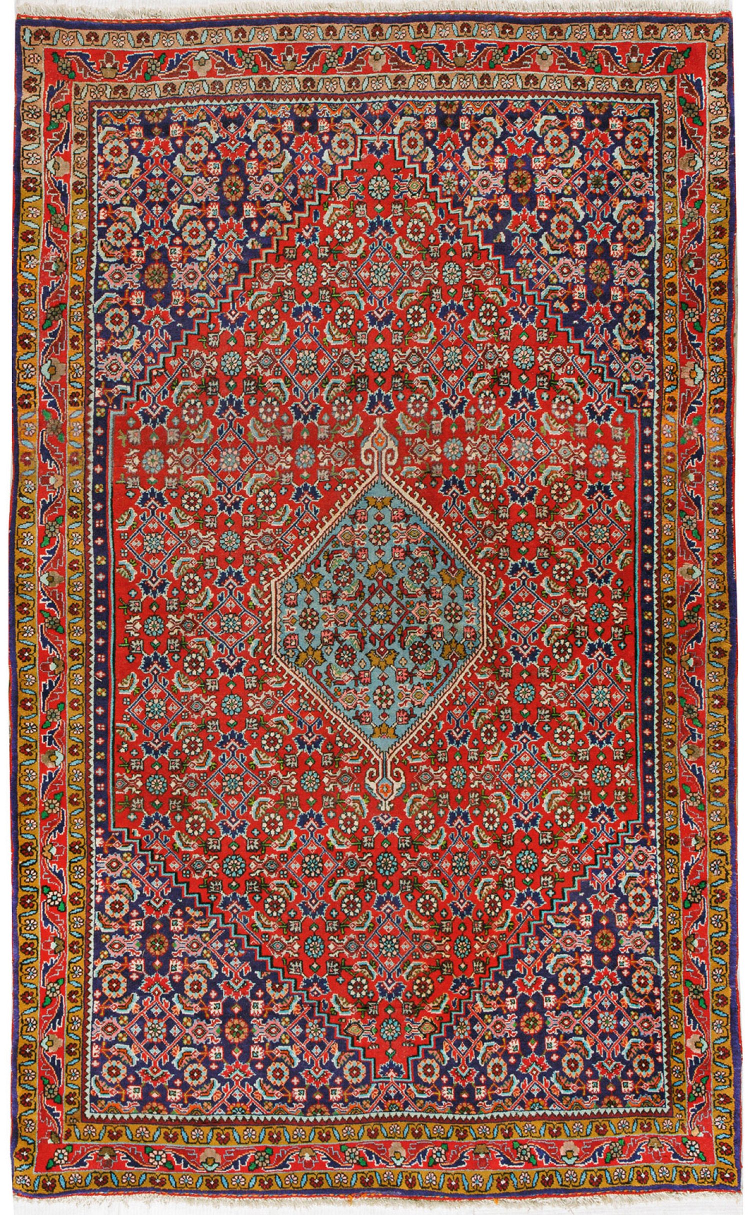 Persien. Wolle auf Baumwolle. Im roten Innenfeld hellblaues Rautenmotiv sowie dunkelblaue Ecklösungen. Flächendeckende Herati-Musterung sowie umlaufend mehrteilige Bordüre. 132 cm x 206 cm.