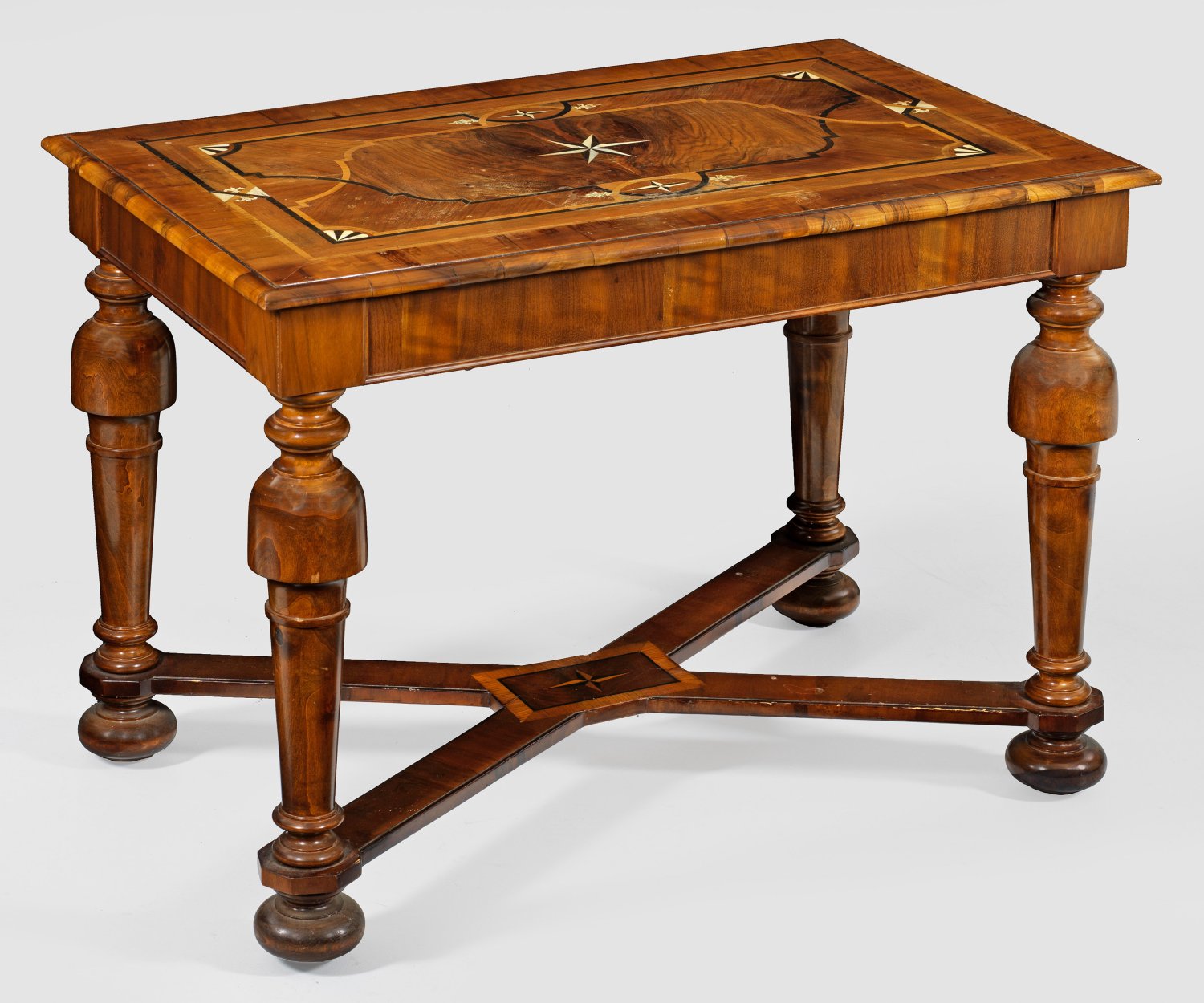 Nussbaum, massiv und furniert sowie Einlagen aus Eschenholz und Elfenbein. Gerade Zarge auf gegliederten Balusterbeinen, unterhalb durch breite, kreuzförmig angelegte Stege verbunden. Gering überstehende, profilierte Deckplatte mit eingelegten Faltsternen, von verschlungenen Bandeinlagen begrenzt. Gebrauchsspuren. H. 79 cm. 109 cm x 69 cm. CITES Bescheinigung liegt vor.