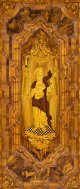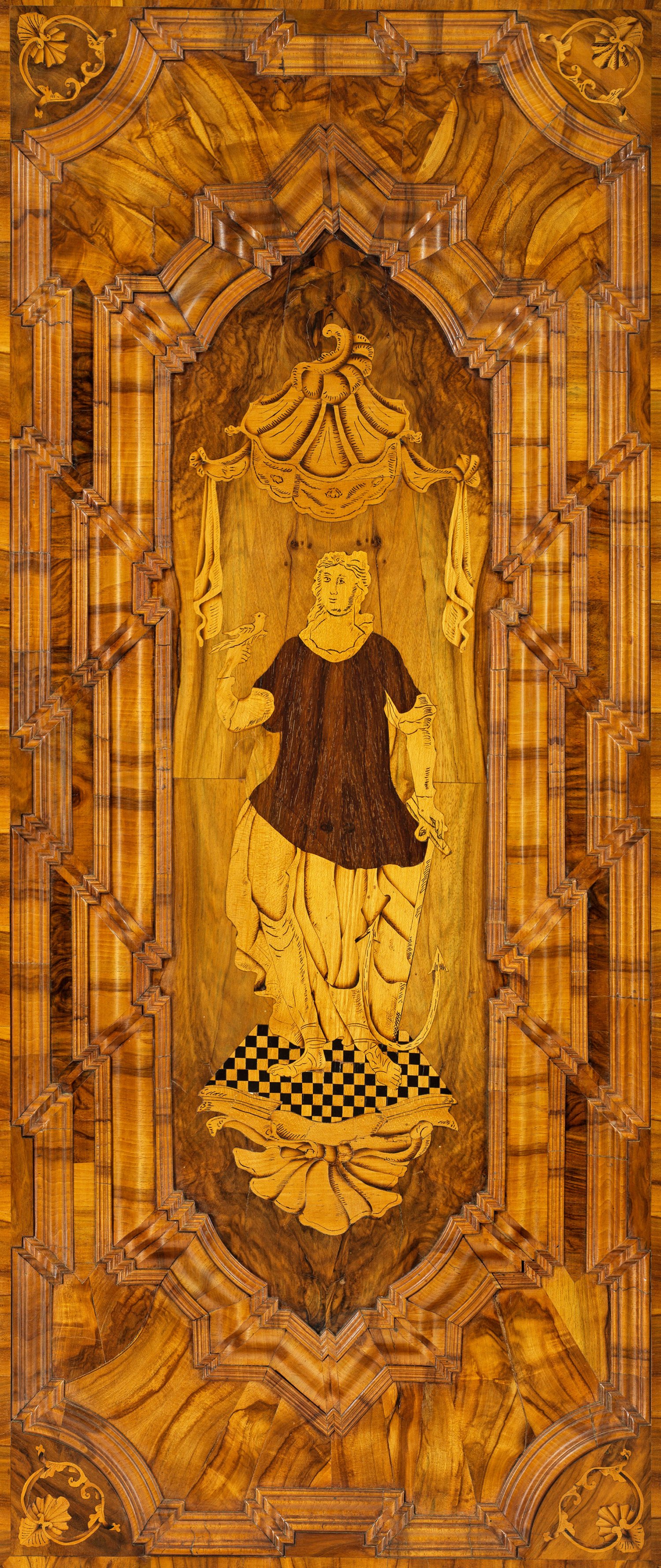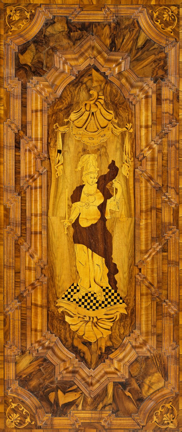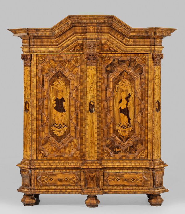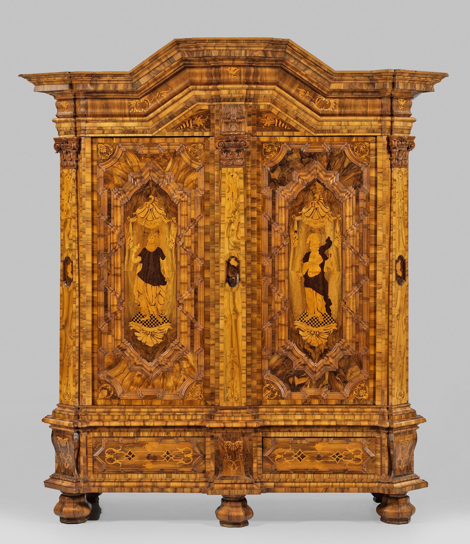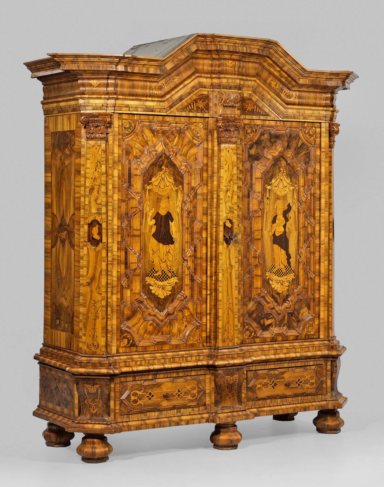 Meisterstück. Nussbaum, teilw. reliefplastisch geschnitzt bzw. furniert. Einlagen aus unterschiedlichen Hölzern wie Ahorn. Gerader, rechteckiger Korpus, flankiert von breiten, schräggestellten Ecklisenen mit aufgelegten Pilastern und plastisch gestalteten, korinthischen Kapitellen auf zweischübigem Zargensockel und gekanteten Balusterfüßen. In der gegliederten Front zwei große Türen mit profilierten Kissenfüllungen mit großen intarsierten, allegorischen Figuren unter Baldachinen. Überaus reich gestaltetes, durchbrochen gearbeitetes Schloss mit flächendeckendem, reliefiertem Blattdekor. Breites, weit vorkragendes, an den Ecken verkröpftes Kranzgesims mit Trapezgiebel. Flächendeckend breit gerahmte Furnierfelder sowie schauseitig reicher Intarsiendekor aus Füllhörnern, Muschel- und Bandelwerk sowie gegeneinandergestellten Voluten. H. 223 cm. 204 cm x 78 cm.