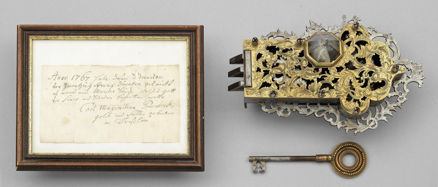 Beiliegend Vermerk des ursprünglichen Besitzers: "Anno 1767 Habe diesen Schrank für 20 Louis Dukaten gekauft es war ein Meisterstück welches Gott for Feuer und Schaden behüren wolle. Carl Maximilian Powalsky. Gold und Silberarbeiten in Breslau."