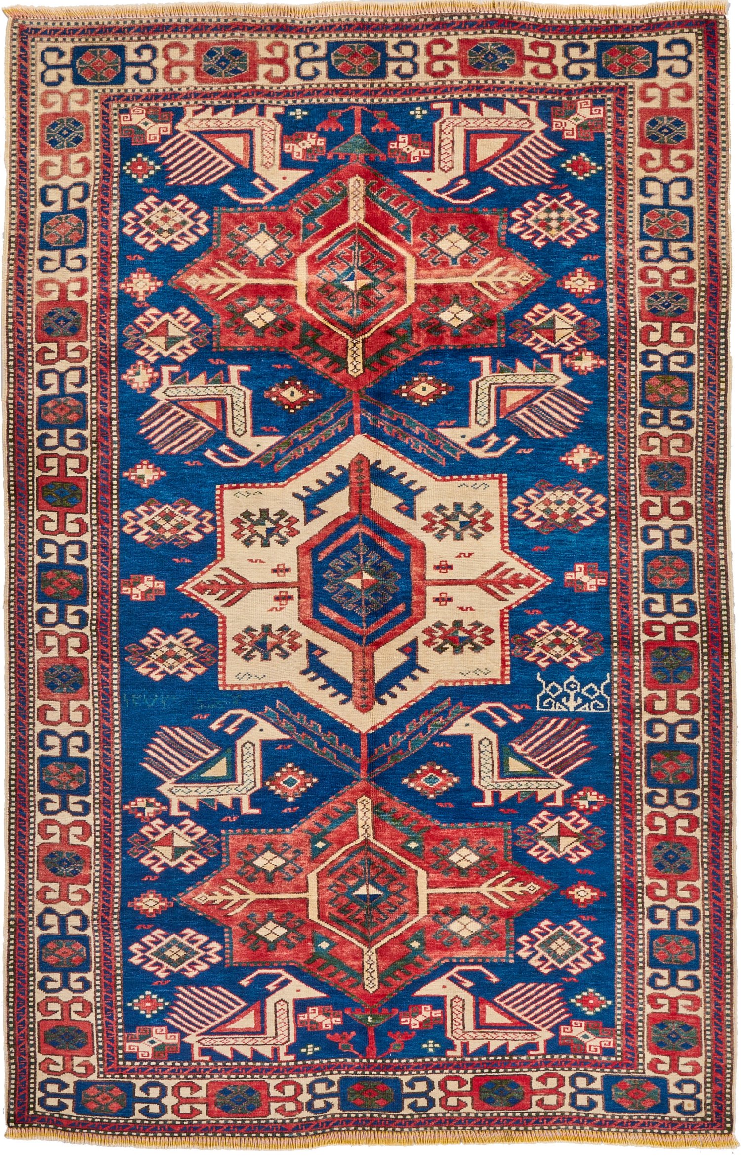 Kaukasus. 1920er Jahre. Wolle auf Wolle. Im blauen Innenfeld drei große kartuschenförmige Medaillons in Elfenbein und Rot sowie flächendeckende Musterung aus stilisierten Drachen und hakenbesetzten Rauten. Umlaufend breite Hauptbordüre, flankiert von schmalen Bändern. Rest.; 192 cm x 120 cm.