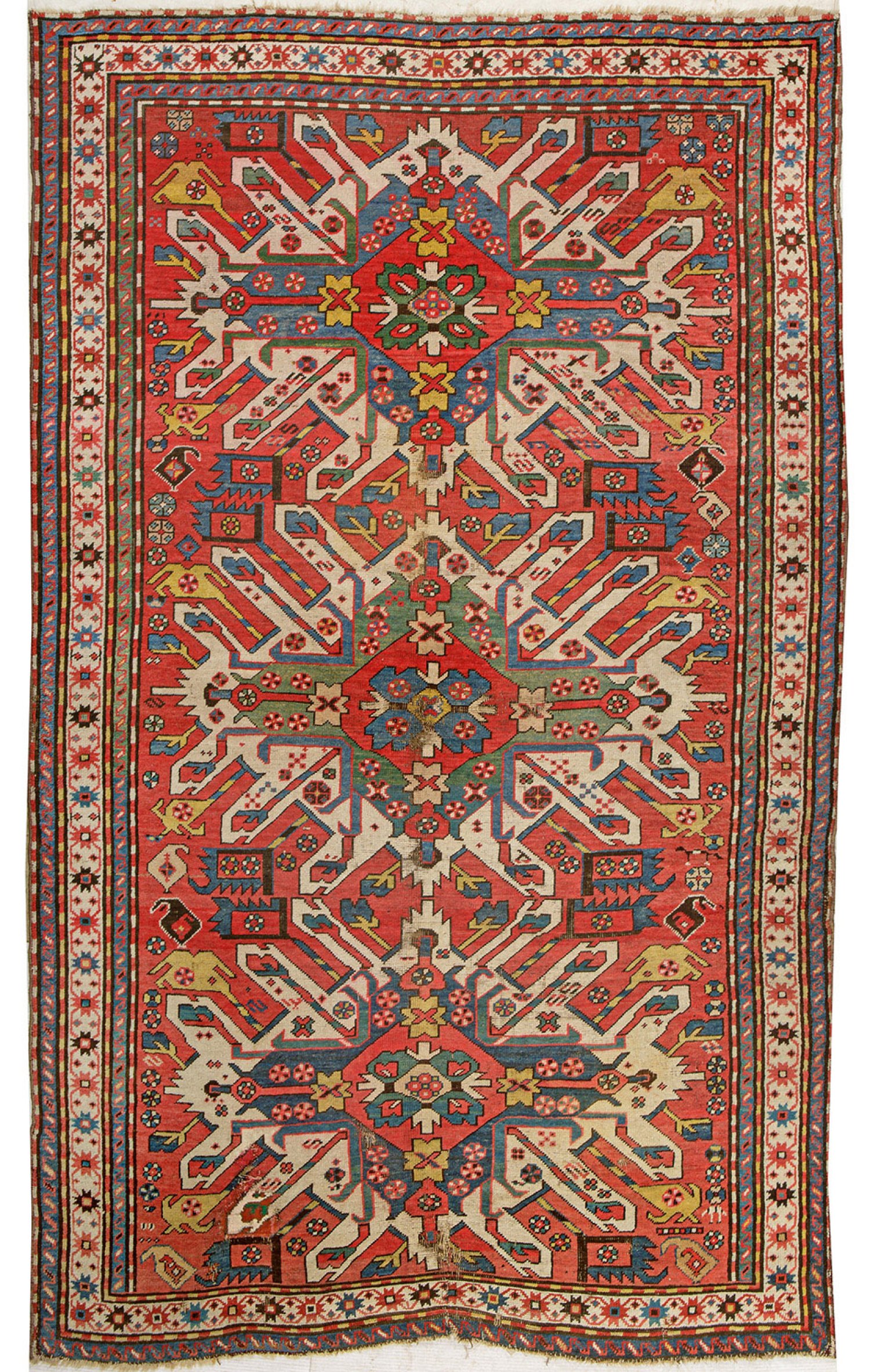 Kaukasus. 1. Hälfte 20. Jh.; Wolle auf Wolle. Im roten Innenfeld drei große, stark stilisierte Adlermotive in Grün- und Blautönen sowie flächendeckende Musterung aus kleinen Rosetten. Umlaufend mehrteilige Ornamentbordüre. Kanten erneuert. Altersspuren. 152 cm x 251 cm.