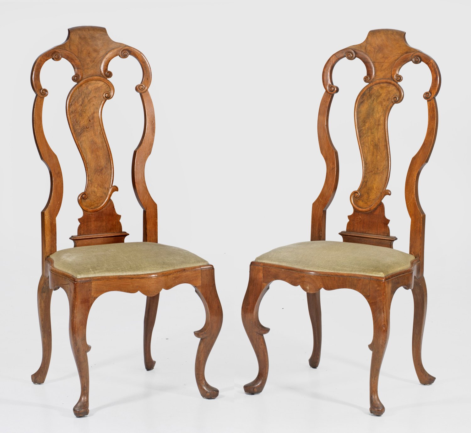 Nussbaum. Passig geschweifte Zarge auf geschwungenen Beinen. Hohe, durchbrochen gearbeitete Rückenlehne mit asymmetrisch gestaltetem Mittelsteg. Sitzfläche gepolstert und bezogen. Sitz-H. 48 cm.