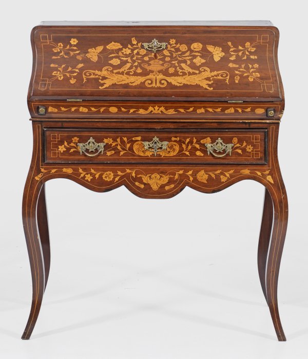 Mahagoni, furniert sowie reiche Einlagen aus Ahorn. Dreiseitig bombierter Korpus auf hohen geschwungenen Beinen. In der gegliederten Front breites Schubfach sowie ausziehbare Stützen für schräggestellte abklappbare Arbeitsfläche. Dahinter gestaffelte Facheinteilung. Schauseitig flächendeckende Marketerie aus Blattvoluten, Blüten und Schmetterlingen. H. 105 cm. 86,5 cm x 48 cm.