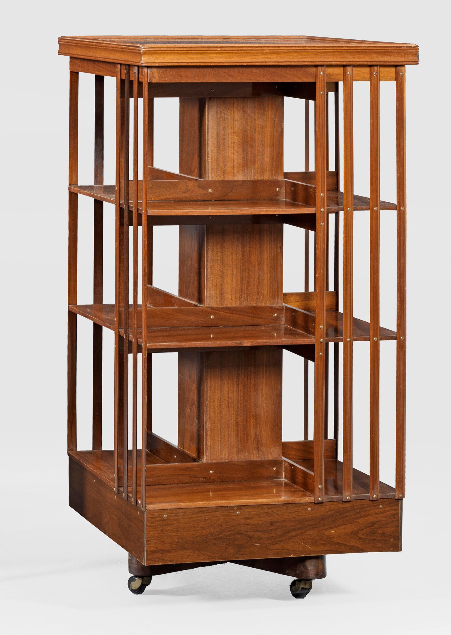 Mahagoni, massiv und furniert. Hochrechteckiger, drehbarer Korpus aus schmalen Streben und Ablageflächen auf Rollen. Umlaufend profilierte Deckplatte. H. 114 cm. 60 cm x 60 cm.