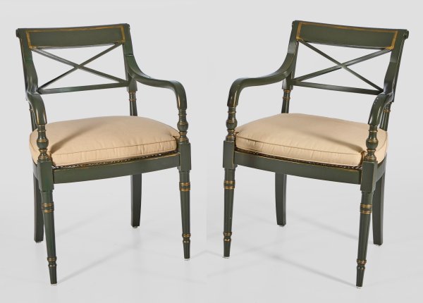 Holz, moosgrün gefasst und teilw. vergoldet. Trapezförmige Zarge auf schlanken Balusterbeinen. Korrespondierende Stützen für geschweift ansteigende Armlehnen. Zurückschwingende Rückenlehne mit breitem oberen Abschluss und kreuzförmigem Mittelsteg. Sitzfläche aus Rohrgeflecht sowie lose Polsterauflage. Sitz-H. 48 cm.
