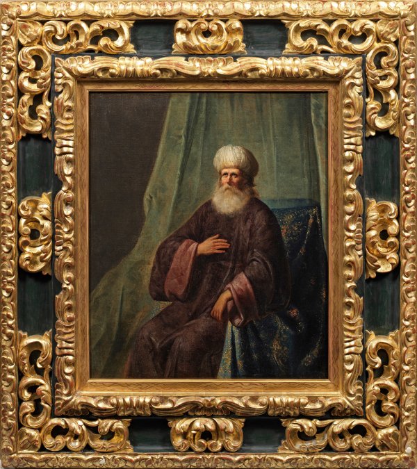 Vor einem lang herunterfallenden, grüngrauen Vorhang sitzender Mann, der in einem kostbaren, blau-goldenen Sessel Platz genommen hat. Offensichtlich handelt es sich bei dem Dargestellten nicht nur um einen hochgestellten Orientalen in korrespondierender Kleidung mit Turban, sondern auch um um einen Weisen, denn er hat seine rechte Hand in beredtem Gestus andächtig an die Brust gelegt und seinen Blick zum Himmel gerichtet. Motiv und Stil des Gemäldes spiegeln den prägenden Einfluss Rembrandts wider, ebenso den seiner Schüler und Zeitgenossen wie Govert Flinck, Jan Lievens und Ferdinand Bol, die zahlreichen vergleichbaren Bildnisse älterer Männer in orientalischen Kostümen schufen. Zugleich ist es ein repräsentatives Beispiel für die westliche Orient-Faszination im 17. Jh.; Pieter de Grebber selbst entwickelte aus verschiedenen Einflüssen, u. a. durch Rubens und Rembrandt, seinen persönlichen Stil. Öl/Lwd., doubl.; 66,5 x 58 cm. Prunkrahmen.