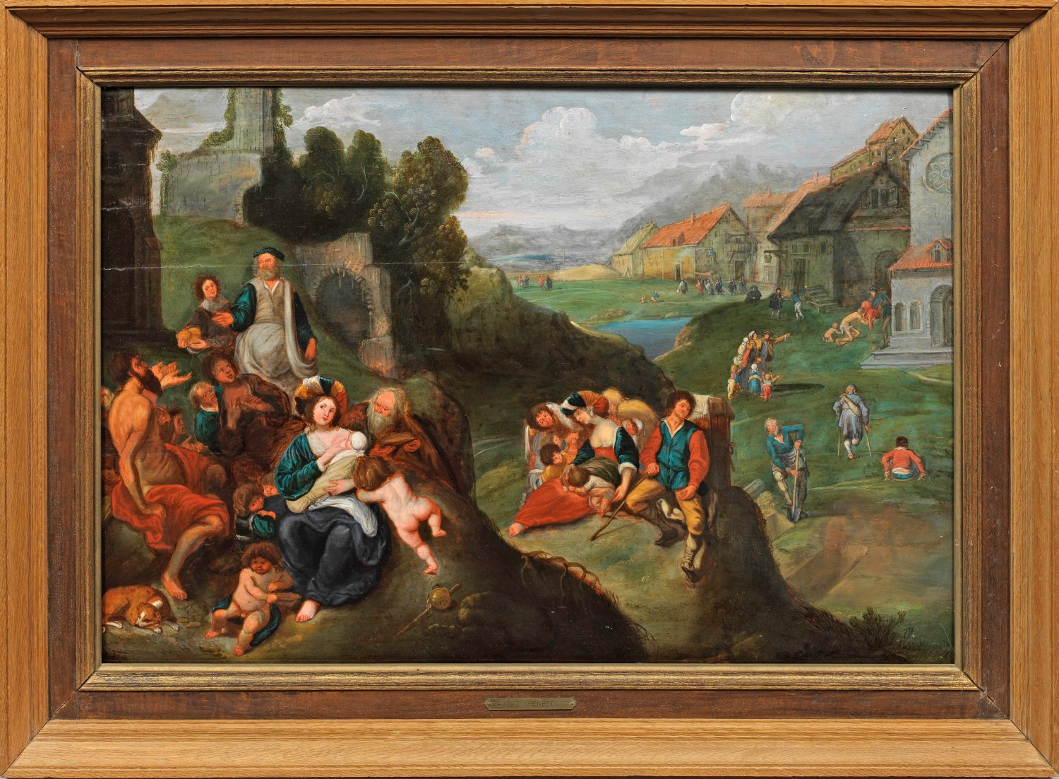 Das fein lasierend ausgeführte Gemälde zeigt simultan in Einzelszenen die verschiedenen christlichen, tugendhaften Werke der Barmherzigkeit: Hungrige speisen, Durstigen zu trinken geben, Fremde beherbergen, Nackte kleiden, Kranke pflegen, Gefangene besuchen und Tote bestatten. Eine eigenhändige, 1635 datierte Version von Simon de Vos, die nur in einigen Details abweicht, befindet sich im Nationalmuseum in Warschau (aus dem Besitz von Stanislaw II August Poniatowski von Polen). Komponiert hat de Vos die Szenen in eine von Bergen umgebene Landschaft, auf der linken Bildseite vor Ruinen, rechts ein Dorf mit Kirche; im Bildhintergrund hat er im Kontrast hierzu eine Alltagszene des 17. Jhs. integriert, wie sie für die Epoche und Zeit des 30-jährigen Krieges typisch war - ein Delinquent wird zum Galgen geführt. Es gehört zu einer Werkreihe mit Darstellungen biblischer Geschichten, Historien und Allegorien, die seit dieser Zeit das Oeuvre von de Vos dominieren, beeinflusst von Peter Paul Rubens, Frans II Francken, Claude Vignon und Anthony van Dyck. Öl/Eichenholztafel, parkettiert. 58 cm x 78,5 cm. Rahmen.