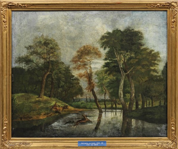 Szenische Darstellung einer Hirschjagd mit zwei berittenen Jägern und einem Hund, der einen flüchtenden Hirsch bis in ein Gewässer verfolgt. Hierbei hat die Landschaft auch symbolische, allegorische Aspekte, da der Künstler abgestorbene Eichen vor Bäumen mit üppigem Laub komponierte. Abgewandelte Version nach dem um 1665/70 entstandenen, größeren Original-Gemälde Ruisdaels in der Staatl. Gemäldegalerie Alte Meister in Dresden (Inv.-Nr. Gal.-Nr. 1492). Öl/Lwd., doubl.; Rest.; 72 cm x 90 cm. Rahmen.