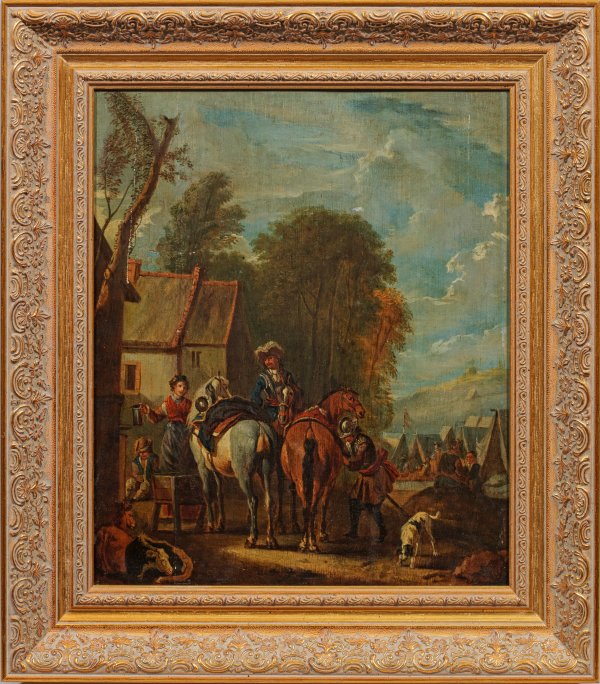 Szenische Darstellung mit einem Motiv des 17. Jhs. mit Zelten eines Soldatenlagers im Mittelgrund. Thema und Stil des Gemäldes spiegelt den über Generationen prägenden Einfluss des auf Pferde spezialisierten Malers Philips Wouwermann wider, dessen Oeuvre eine Reihe vergleichbarer Gemälde mit Reitern vor einer Herberge bzw. Lager umfasst. Öl/Eichenholztafel. 37,5 cm x 30,5 cm. Rahmen.