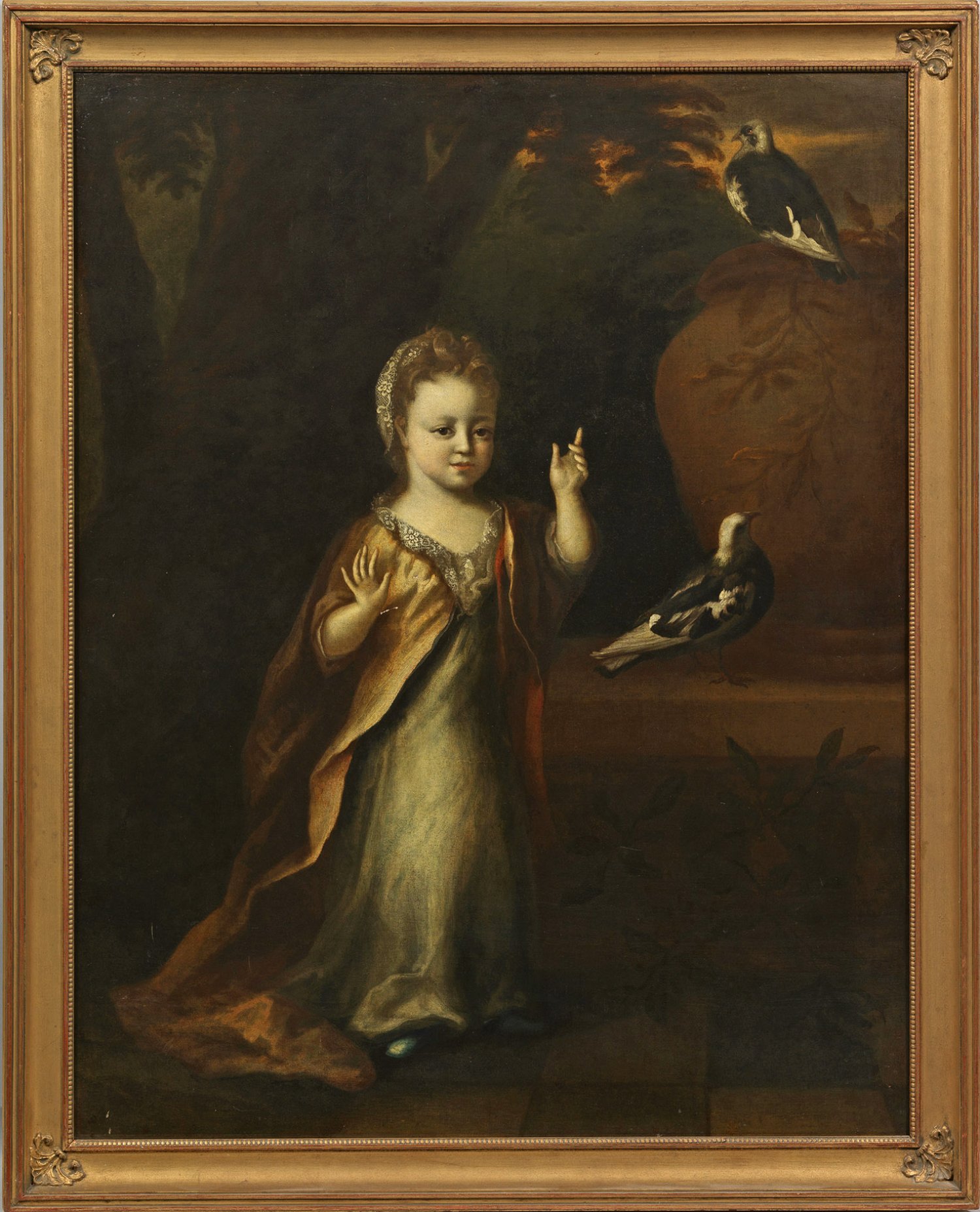 Ganzfiguriges, lebensgroßes Bildnis eines jungen Mädchens in langem, spitzenverziertem Kleid vor einem Parkhintergrund. Feinfühlig charakterisierendes, feinflüssig gemaltes Kinderbildnis des niederländisch-flämischen Barock, in dem Künstler wie Nicolaes Maes vergleichbare Mädchenporträts schufen. Öl/Lwd., doubl.; 127 cm x 101 cm. Rahmen.