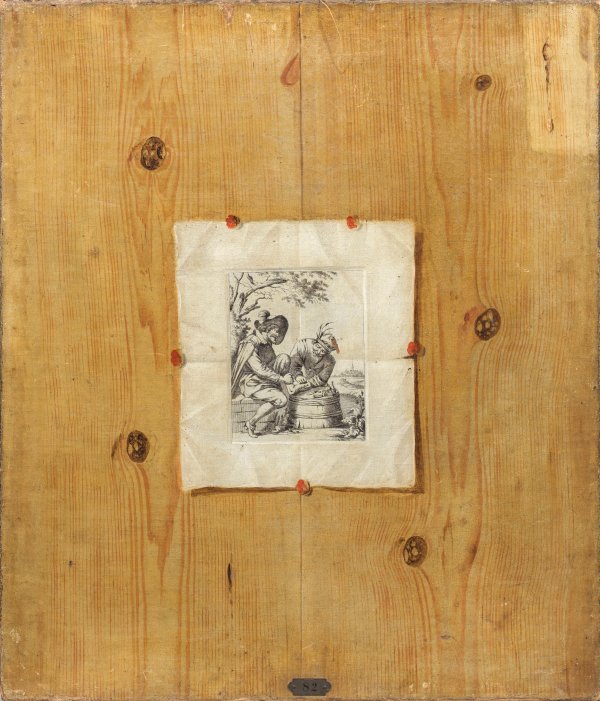 Motiv und Stil spiegeln den prägenden Einfluss von Edwaert Collier wider, der außer Vanitas-Stillleben auch eine Reihe vergleichbarer Trompe-l’oeil-Gemälde mit effektvoll an Holzwänden komponierten Stichen schuf. Collier wurde 1664 in die Haarlemer Gilde aufgenommen, seit 1667 war er in Leiden tätig, 1686 zog er nach Amsterdam und 1693 nach London. Öl/Lwd.; Ger. Läsur, am Unterrand montierte Sammlungs-Nr.; 65,5 cm x 56,5 cm.