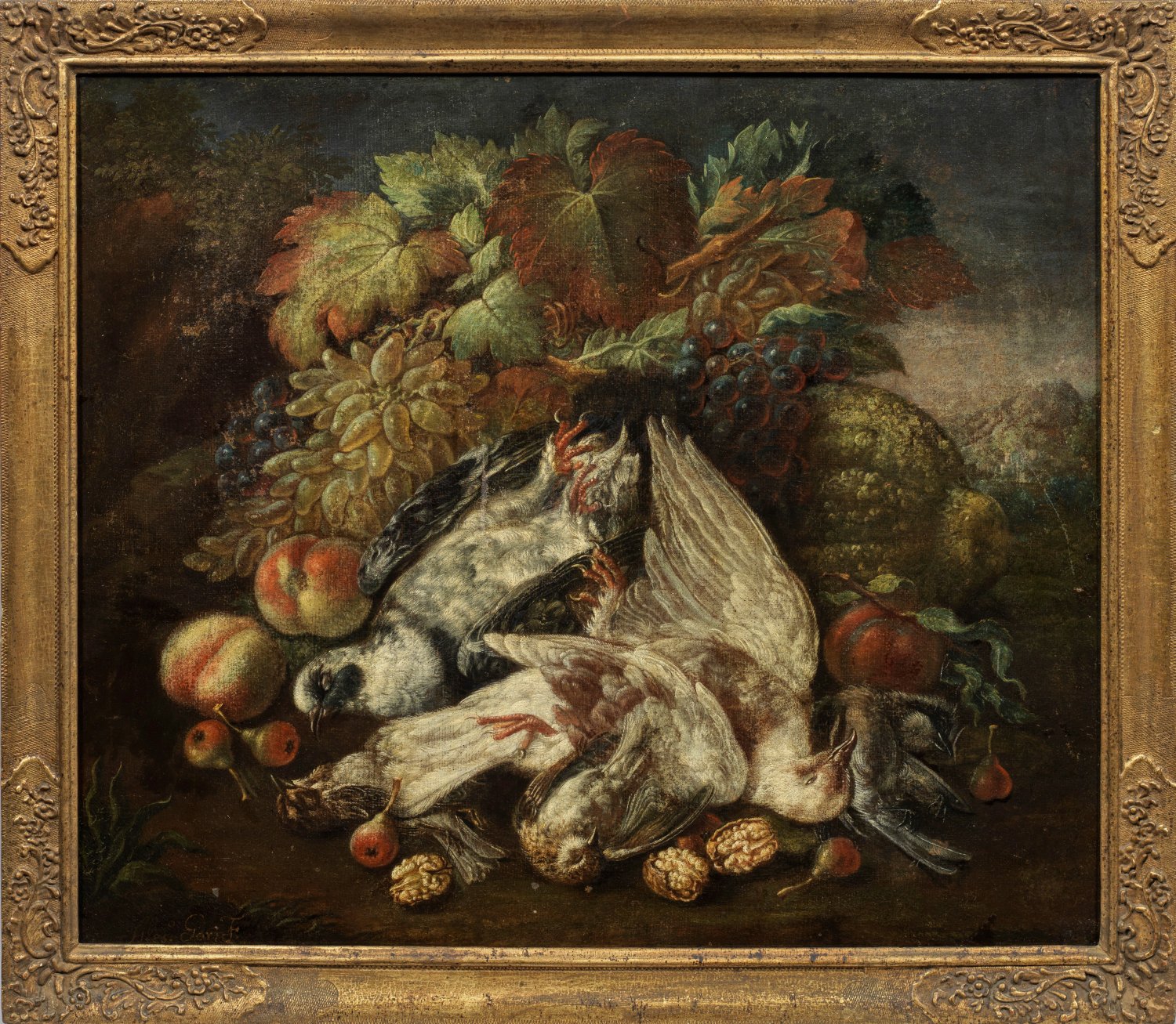 In äußerster Naturtreue gemaltes, in einer Landschaft arrangiertes Stillleben mit erlegten Vögeln, Weinreben, Kürbis, Pfirsichen, Birnen und Walnüssen. Stil- und sujettypisches Kabinettstück des italienischen Malers, der in Florenz tätig war. Alessandro Gori war auf Jagdstillleben spezialisiert, Werke befinden sich u. a in der Eremitage in St. Petersburg und im Royal Cornwall Museum. Öl/Lwd., doubliert. L. u. sign. sowie mit Ortsangabe "F" für Florenz. 61 cm x 72 cm. Rahmen.