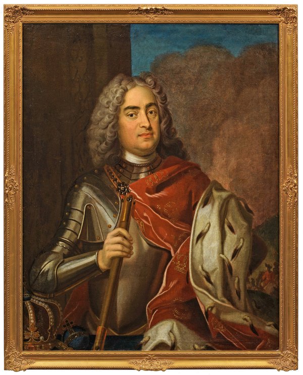 Das um 1700 entstandene, repräsentative Porträt gibt August den Starken (1670 - 1733) als jungen König kurz nach dessen Erwerb der polnischen Königswürde im Jahr 1697 wieder, wodurch er als gekröntes Haupt nicht nur eine bedeutende Rangerhöhung erreichte, sondern sich auch eine größere politische Souveränität sicherte. Dies drückt sich auch in diesem Gemälde aus. August der Starke ließ sich mit schulterlanger Allongeperücke in einem Brustharnisch darstellen, umgelegt hat er einen roten, mit goldenen Königskronen bestickten Hermelinmantel, als Symbol seiner Macht und seines Ranges sind zu seiner Rechten überdies eine Königskrone und ein Reichsapfel geschildert. Zugleich demonstriert August der Starke seine Macht als Feldherr, indem er einen entsprechenden Stab in der rechten Hand hält, während im Hintergrund eine Schlachtenszene mit einem Reiter angedeutet ist. Dies könnte im Bezug zum 1700-1721 geführten Nordischen Krieg um die Vormacht im Ostseeraum zu sehen sein, an dem sich auch das sächsisch-polnische Heer unter August dem Starken in Allianz mit Zar Peter I. von Russland gegen Schweden beteiligte. Vom Porträtmaler David Hoyer haben sich nur wenige Gemälde erhalten, meist nur Stiche nach seinen Bildnissen. Hoyer lernte bei dem böhmischen Porträtisten Johann Kupetzky; als gefragter Künstler war er außer für den sächsisch-polnischen Königs- und Kurfürstenhof auch für Brandenburg-Preußen und Hessen-Kassel tätig. Öl/Lwd., doubl.; 106 cm x 84,5 cm. Rahmen.
