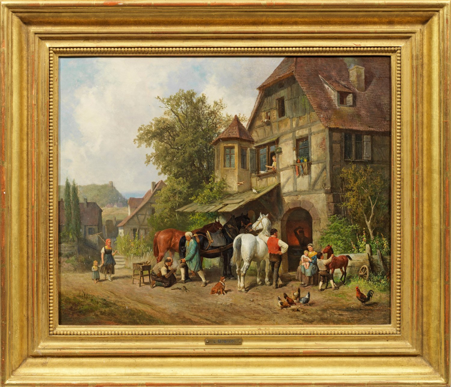 Feinmalerisch und lebendig geschilderte, stimmungsvolle Darstellung, die meisterhafte Genre-, Tier- und Landschaftsmalerei verbindet. Reinhold Braun, der ältere Bruder von Louis Braun, erhielt seine künstlerische Ausbildung an der Kunstschule zu Stuttgart und als Schüler von Johann Friedrich Voltz und Carl Friedrich Heinzmann in München. 1849 malte er im Gefolge des Prinzen Friedrich Karl von Preußen während der Niederschlagung der Badischen Revolution. Für die Kronprinzessin Olga von Württemberg in Stuttgart schuf er einen Zyklus von Genrebildern aus dem schwäbischen Volksleben. Durch seine künstlerisch herausragenden Pferdebilder erhielt Braun den Ehrennamen eines "schwäbischen Wouwerman". 1872 ging er endgültig nach München, wo seine Gemälde und Aquarelle ebenfalls großen Anklang fanden. Öl/Mahagonitafel. L. u. sign. u. dat. 1879 mit Ortsangabe München. 36,5 cm x 46 cm. Rahmen.