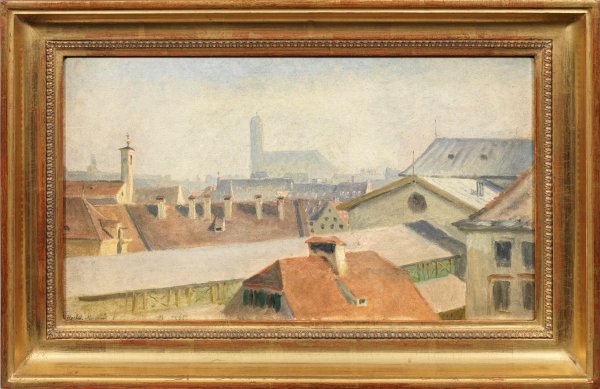 Atmosphärischer Blick über die Münchner Innenstadt von den Dächern der Schrannenhalle am Viktualienmarkt zur Silhouette der Frauenkirche, die sich im leichten Nebel des herbstlichen Morgenhimmels zart abzeichnet. In pastelltonigem Kolorit und frühimpressionistischer Lichtbehandlung gemalte Vedute des in Hamburg geborenen Malers, der zunächst eine Lehre in der Grafikwerkstatt der Gebr. Suhr absolvierte und anschließend auf ausgedehnte Studienreisen quer durch Deutschland, nach Russland und durch das Baltikum ging. Ab 1824 Schüler bei Siegfried Bendixen in Hamburg, vollendete er sein Studium an der Akademie in Kopenhagen und reiste mehrere Monate durch Schweden und Norwegen. 1830 wurde der Landschaftsmaler in München ansässig, begab sich aber immer wieder auf ausgedehnte Reisen nach Norddeutschland, Österreich, Italien und ins Elsass. Seine Motive fand er vornehmlich auf seinen zahlreichen Reisen, setzte diese unmittelbar vor der Natur um und avancierte schnell zu einem vielfach prämierten, bedeutenden Vertreter der Münchener Freilichtmalerei aus der ersten Hälfte des 19. Jhs.; Öl/Papier, kaschiert auf Holztafel. L. u. bez. "Herbst. Morgendl..." (?), monogr. und dat. 1865. Verso von fremder Hand bez. und nochmals dat.; 23,5 cm x 42,5 cm. Rahmen.