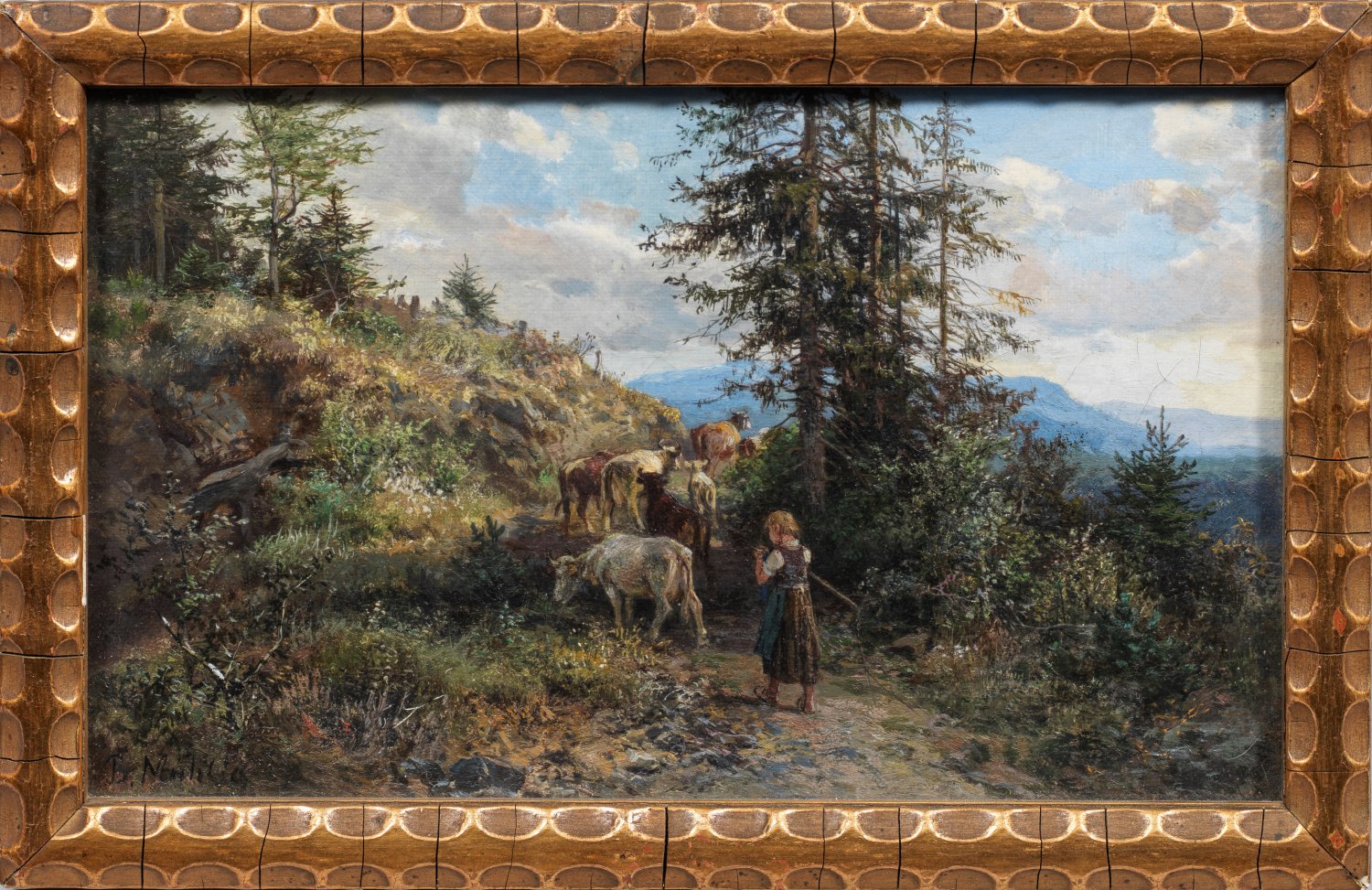Unter hellblau strahlendem, duftig bewölktem Himmel läuft das Hirtenmädchen mit ihrer Rinderherde einen saftig grün bewachsenen Pfad bergaufwärts, im Hintergrund öffnet sich der Blick auf sanfte Gipfel einer Gebirgslandschaft. Stimmungsvoll eingefangene Landschaftsimpression des Dresdener Künstlers, der ab 1854 u. a. auf den dortigen Akademieausstellungen vertreten war. Öl/Lwd., kaschiert auf Karton. L. u sign.; Ca. 16 cm x 26 cm. Rahmen.