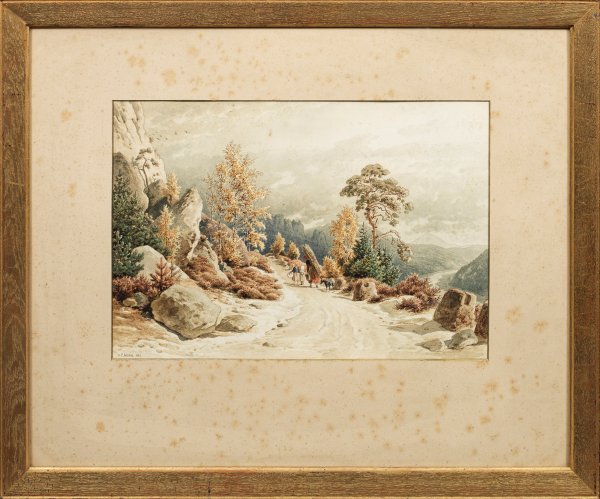 Spätromantische, charakteristische Landschaft Mohns, der an der Akademie in Dresden ausgebildet wurde und Schüler bei Adrian Ludwig Richter war. Sein Oeuvre umfasst überwiegend Landschaftsmotive aus seiner sächsischen Heimat und Italien, wo er in den 1860er Jahren ausgedehnte Studienreisen unternahm. Aquarell/Papier. L. u. sign. und dat. 1882. Passepartoutausschnitt 33 cm x 48 cm. Rahmen.