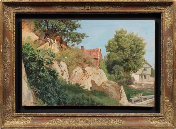 In strahlendem, sommerlichem Kolorit und mit feinmalerischem Duktus komponierte Ansicht des beschaulichen Dorfes bei Halberstadt im Harz. In Stil und Motiv charakteristisches Werk des Hamburger Malers, der sich als Erneuerer der Landschaftsmalerei von der Romantik abwandte und durch äußerst subtile Naturbeobachtung feinfühlige Licht- und Luftstimmungen einfing. Ruths besuchte 1846-1848 die Münchner Akademie, bildete sich bei Johann Wilhelm Schirmer in Düsseldorf weiter und kehrte schließlich 1857 nach Hamburg zurück. Öl/Holzplatte. L. u. sign.; Rückseitige Etiketten mit Ortsangabe. 34,9 cm x 53,9 cm. Rahmen.