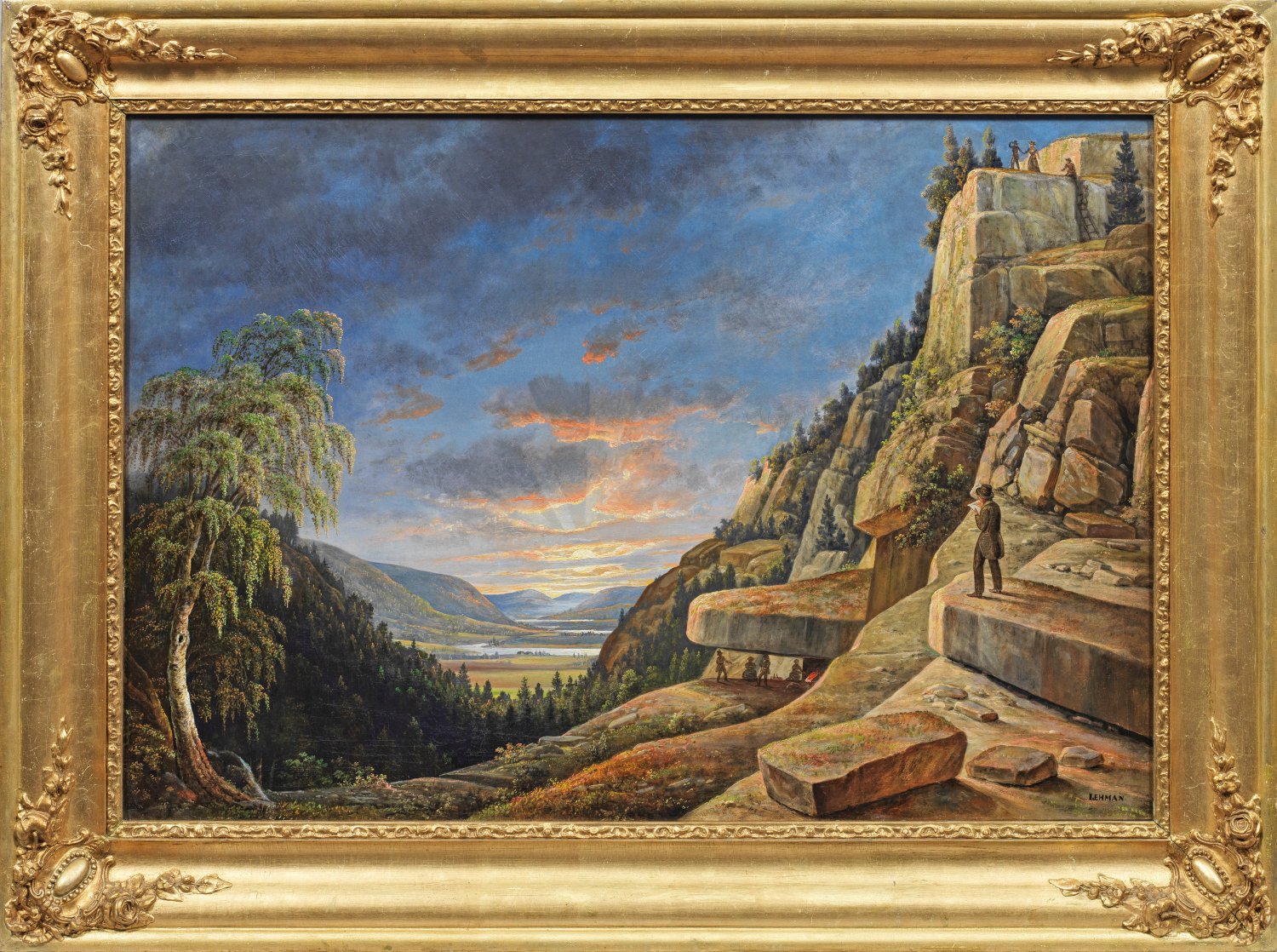 Romantische, wohl 1837/38 entstandene romantische, die Erhabenheit der Natur feiernde Ideallandschaft mit Ansicht eines weiten Tals. Auf der rechten Bildseite ein Felsenhang, im Vordergrund ein Künstler in Rückenansicht beim Zeichnen, im Mittelgrund eine unter einem Felsdach rastende Gesellschaft am Lagerfeuer, auf der Bergspitze eine kleine Gruppe eleganter Bergwanderer an einer Leiter, in der Bildmitte ein sich schlängelnder Fluss und ein Himmel mit dem Licht der untergehenden Sonne, welche die Wolken durch einzelne Strahlenbündel erglühen lässt. Seltene, wohl durch Caspar David Friedrich inspirierte Landschaft des deutsch-französischen Künstlers. Der aus einer Künstlerfamilie stammende Maler ging 1831 nach Paris und trat in das Atelier von Jean-Auguste-Dominique Ingres ein. 1835 debütierte er im Salon, 1837 beauftrage ihn König Louis Philippe den Tod Roberts des Starken für die Galerie von Versailles zu malen. 1837/38 lebte und arbeitete Lehmann in München, wo sein Bruder Rudolf Lehmann die Kunstakademie besuchte. Während eines Rom-Aufenthaltes und seit 1842 in Rom ansässig, wurde Lehmann ein begehrter Porträtist, der u. a. Franz Liszt und seine Partnerin Marie d’Agoult, Stendhal, Chopin, Meyerbeer und Alexander von Humboldt malte. 1846 ernannte man ihn zum Ritter und 1853 zum Offizier der Ehrenlegion; 1864 wurde er Mitglied der Académie des Beaux-Arts und 1875 zum Professor ernannt. Öl/Lwd.; R. u. sign.; 65 cm x 95,5 cm. Rahmen.