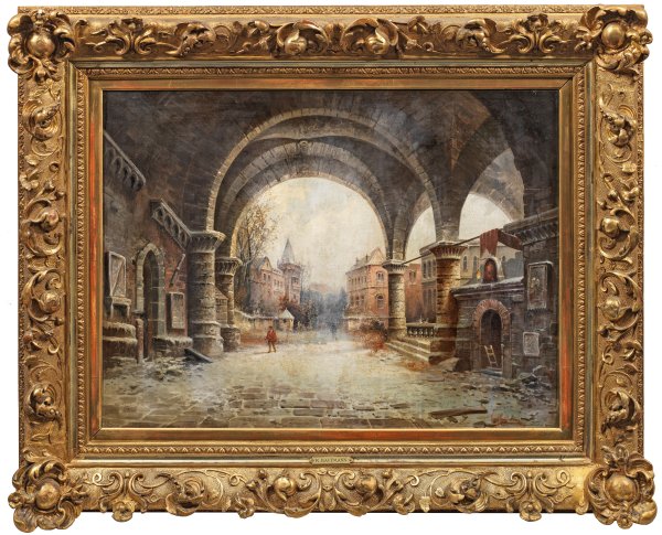 Durch sein Motiv außergewöhnliches Werk des vielseitigen Künstlers in der Tradition von Carl Georg Adolf Hasenpflug und Wilhelm Steuerwaldt. Nach seinem Studium an der Wiener Kunstakademie wandte sich Kaufmann den unterschiedlichsten Landschaften und Stadtansichten zu. Öl/Lwd.; R. u. sign.; 74 cm x 100 cm. Prunkrahmen.
