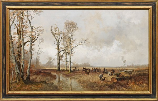 1884 entstandene, stimmungsvolle Landschaftsimpression Wengleins, die in der Wiedergabe des Lichts und des Himmels sowie der Erfassung der Natur seine hohe Meisterschaft widerspiegelt, in einfühlsamer, subtiler Weise den gesehenen Eindruck einzufangen. Wenglein lernte 1866-1870 bei Johann Gottfried Steffan und 1870-1873 bei Adolf Lier, der ihm die künstlerischen Impulse der Schule von Barbizon vermittelte. 1883 wurde er Professor, 1886 Ehrenmitglied der Münchener Akademie. Mit Ludwig Willroider und Adolf Lier zählt Wenglein zu den letzten Hauptvertretern der alten Münchener Landschaftsschule. Ein bevorzugtes Motiv Wengleins waren die Moos- und Moorlandschaften Oberbayerns, die er auch mit Jägern staffierte. Im Entstehungsjahr des vorliegenden Gemäldes zeigte er vergleichbare Werke in der Berliner Akademie und Wiener Jahresausstellung: "Im Moos", "Aus dem Ampermoos" und "Herbstlandschaft". Öl/Lwd.; L. u. sign. u. dat., (18)84 mit Ortsangabe München. Verso Rest eines Original-Ausstellungsetiketts mit Künstler-Bez., altes Etikett der Galerie Heinemann, München; 58 cm x 78 cm. Rahmen.