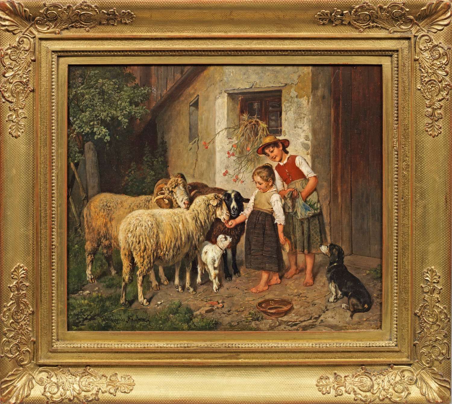 Zwei Bauernmädchen beim Füttern von Schafen vor dem Stall