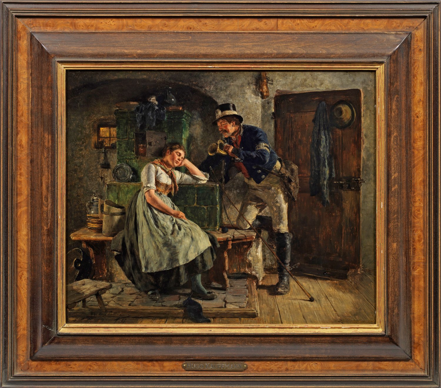 In einer bäuerlichen, heimeligen Stube sitzt eine über ihrer Strickarbeit eingenickte, junge Magd am Kachelofen. Über sie gebeugt steht der Postillon, der seine Reitgerte abgelegt hat und gerade sein Posthorn zum Mund führt, um die junge Frau durch eine lautstarke Fanfare unsanft zu wecken. Erzählerische, den kurzen Moment vor dem schreckvollen Erwachen darstellende Genreszene Kauffmanns, der als Sohn des bedeutenden Hamburger Genre- und Landschaftsmalers Hermann Kauffmann (1808 - 1889) von 1861 bis 1863 am Städel'schen Kunstinstitut in Frankfurt a. M. studierte und ab 1871 in München und Prien ansässig war. In seinem Oeuvre zeigt sich besonders seine Begabung als herausragender Schilderer humoristischer, subtil beobachteter Szenen, voll erzählerischer Kraft aus dem bayerischen Volksleben. Meist komponierte er diese in Wirts- und Bauernstuben mit feinem Gefühl für Details und Lichtstimmungen. Öl/Mahagonitafel. L. u. dat. (18)87 und sign.; Verso Ausstellungs- oder Inventarnummer 447 auf altem Papieretikett. 37,5 cm x 46,3 cm. Rahmen.