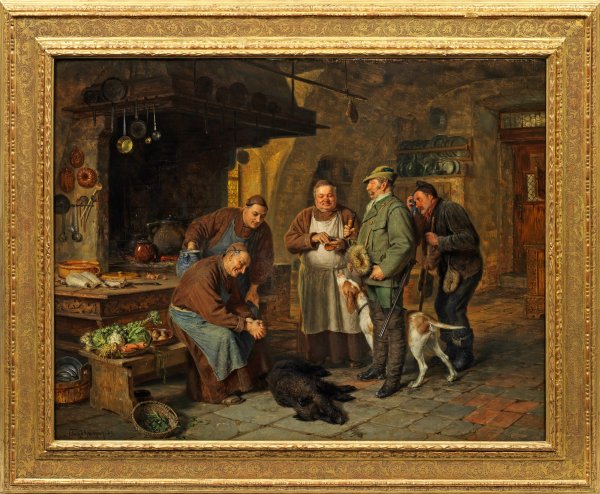 Fein lasierend gemaltes Hauptwerk Grützners mit einer für ihn charakteristischen, stimmungsvollen, erzählerischen Szene aus dem Klosterleben. 1889 berichtete die führende Kunstzeitschrift der damaligen Zeit "Die Kunst für alle" über die Entstehung des Gemäldes: "München. Im Atelier Ed. Grützners ist wiederum ein größeres Ölbild vollendet, das den Titel 'Willkommenes Geschenk' erhalten soll. Der Künstler führt uns in eine Klosterküche und schildert den Moment, als der benachbarte Gutsherr einen soeben geschossenen Frischling dem Pater Küchenmeister zu Füßen gelegt hat. Mit großem Interesse wird das willkommene Geschenk vom Küchenmeister und zwei dienenden Brüdern betrachtet und dieses Interesse ist allerdings begreiflich, denn der auf dem Küchentisch liegende Stockfisch deutet die Fastenzeit an. Nun ist sie zu Ende, und der Frischling soll den ersten Braten abgeben! Das Bild ist wie alle Werke Grützners mit großer Liebe bis ins geringste Detail durchgeführt, die Farbe durchaus unmanieriert und das zweifache Eindringen des Lichts von besonderem Reiz". In der Tat ragt das vorliegende Gemälde nicht nur durch seinen vollendeten Detailreichtum und die subtile Lichtführung, sondern auch durch die Lebendigkeit im Erzählerischen und die Schilderung der einzelnen Figuren heraus: meisterhaft bis hin zum erschöpften Jagdgehilfen auf der rechten Bildseite und dem Jagdhund, der zum wohlbeleibten, zufriedenen Küchenmeister und seiner Schnupftabaksdose aufschaut. Nach seinem Akademiestudium bei Hermann Anschütz und Carl von Piloty 1865-1870 hatte Grützner rasch großen Erfolg und wurde zu einem der bedeutendsten und bis heute populärsten Münchener Genremaler. Hauptsujets Grützners waren Falstaff-Darstellungen, Kardinäle bei der Lektüre und als Sammler sowie heitere Motive aus dem klösterlichen Leben- insbesondere Mönche, die sich sinnenfroh und ausgiebig irdischen Genüssen wie Essen und Trinken hingeben. Seit 1868 beschickte er regelmäßig mit Erfolg Ausstellungen in München, Wien, Berlin und anderen Städten. Öl/Holztafel. L. u. sign. u. dat. (18)89. 70,5 x 91 cm. Rahmen.