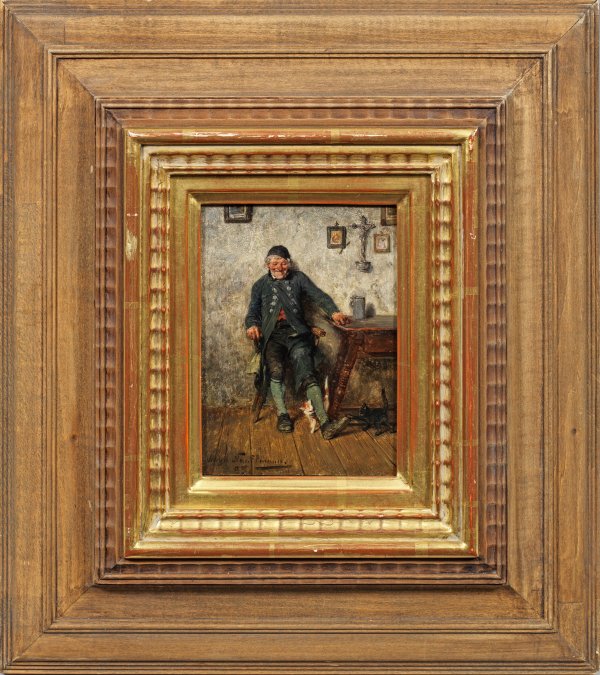 Mit subtiler Detailliebe geschilderte, heimelige Genreszene, das die Freude des älteren, charaktervoll dargestellten Bauern über die mit ihm spielenden, jungen Katzen wiedergibt. Fein gemaltes, charakteristisches Kabinettbild Hugo Kauffmanns, Sohn des bedeutenden Hamburger Genre- und Landschaftsmalers Hermann Kauffmann (1808 - 1889). 1861-1863 studierte er am Städel'schen Kunstinstitut in Frankfurt a. M. und war ab 1871 in München und Prien ansässig. In seinem Oeuvre zeigt sich seine Begabung als herausragender Schilderer humoristischer, subtil beobachteter Szenen aus dem bayerischen Volksleben voll erzählerischer Kraft. Meist komponierte er diese in Wirts- und Bauernstuben mit feinem Gefühl für Details und Lichtstimmungen. Öl/Mahagonitafel. L. u. sign. u. dat. (18)85. Verso altes Galerie-Etikett. 13,5 cm x 10 cm. Rahmen.