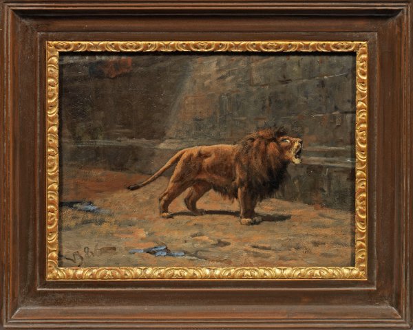 Durch einen einfallenden Sonnenstrahl effektvoll inszenierte Szene, die einen brüllenden Löwen in der Arena des Colosseums zeigt, während oben links noch ein Blick auf die gefüllten Zuschauerränge möglich ist. Reizvolles Tierstück Irmingers, das während seines Studienaufenthalts in Italien (1884-1887) entstand. Der an der Akademie seiner Heimatstadt Kopenhagen ausgebildete Künstler stellte ab 1875 regelmäßig in Charlottenborg aus und präsentierte seine Werke u. a. auch in München, Berlin und Hamburg. Öl/Lwd.; L. u. monogr. und dat. (18)86. 33,5 cm x 45 cm. Rahmen.