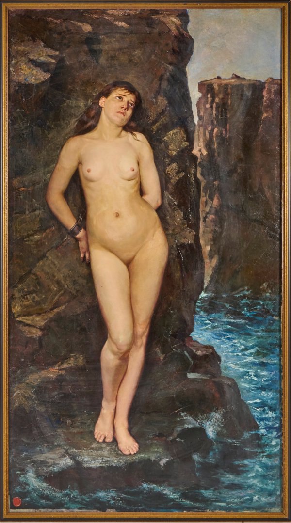 Lebensgroße, mythologische Aktdarstellung der an einen Felsen am Meer stehenden, geschmiedeten Andromeda, welche später durch Perseus vor einem Ungeheuer gerettet und zur Frau genommen wird. 1888 geschaffenes, eindrucksvolles, trotz des mythologischen Motivs explizit erotisches Hauptwerk des schwedischen Malers, gemalt während des Höhepunktes seines künstlerischen Schaffens in den 1880er- und 1890er-Jahren. Hoppe studierte 1881-1887 an der Kunstakademie in Stockholm, 1888-1889 in Kopenhagen und anschließend bis 1892 in Paris bei Léon Bonnat. Er unternahm bis 1898 Studienreisen nach Frankreich, Italien und Deutschland, wobei er sich längere Zeit in München aufhielt. In Schweden wurde Hoppe ein gefragter Porträtmaler, unterrichtete u. a. an Mal- und Kunstschulen. Werke Hoppes befinden sich in Museen in Ystad und Malmö, darunter Genre- und Landschaftsbilder sowie Frauenakte, Innenräume und Porträts. Öl/Lwd.; L. u. dänisches Wachs-Siegel "Gammelholms Toldkontroll" des Kopenhagener Zolls, verso Nachlass-Stempel und Echtheitsbestätigung der Familie durch Ebba Liedbarg Hoppe und Gunnar Hoppe, Etikett mit Nr. 999, Betitelung u. Dat. 1888. 208 cm x 113,5 cm. Rahmen.