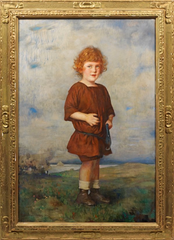 Lebensgroßes, feinfühlig erfasstes Kinderporträt. Schuster-Woldan studierte an der Kunstakademie Stuttgart und bei Frank Kirchbach in München und Frankfurt am Main. Nach Abschluss seiner Studien lebte und arbeitete er in München, wo er zum Vorstand der Luitpold-Gruppe gehörte, seit 1918 in St. Georgen. Bekannt wurde Schuster-Woldan zunächst als Maler großformatiger Sagen- und Märchenbilder, später wandte er sich erfolgreich Kinder- und Damenporträts zu, die in der "Jugend" und bekannten Kunstzeitschriften publiziert wurden. 1904 erhielt der Maler die Bronze-Medaille auf der Weltausstellung in St. Louis, 1911 den Professorentitel. Öl/Lwd.; L. u. sign. u. dat. 1914. 127 cm x 88 cm. Wohl Original-Rahmen.