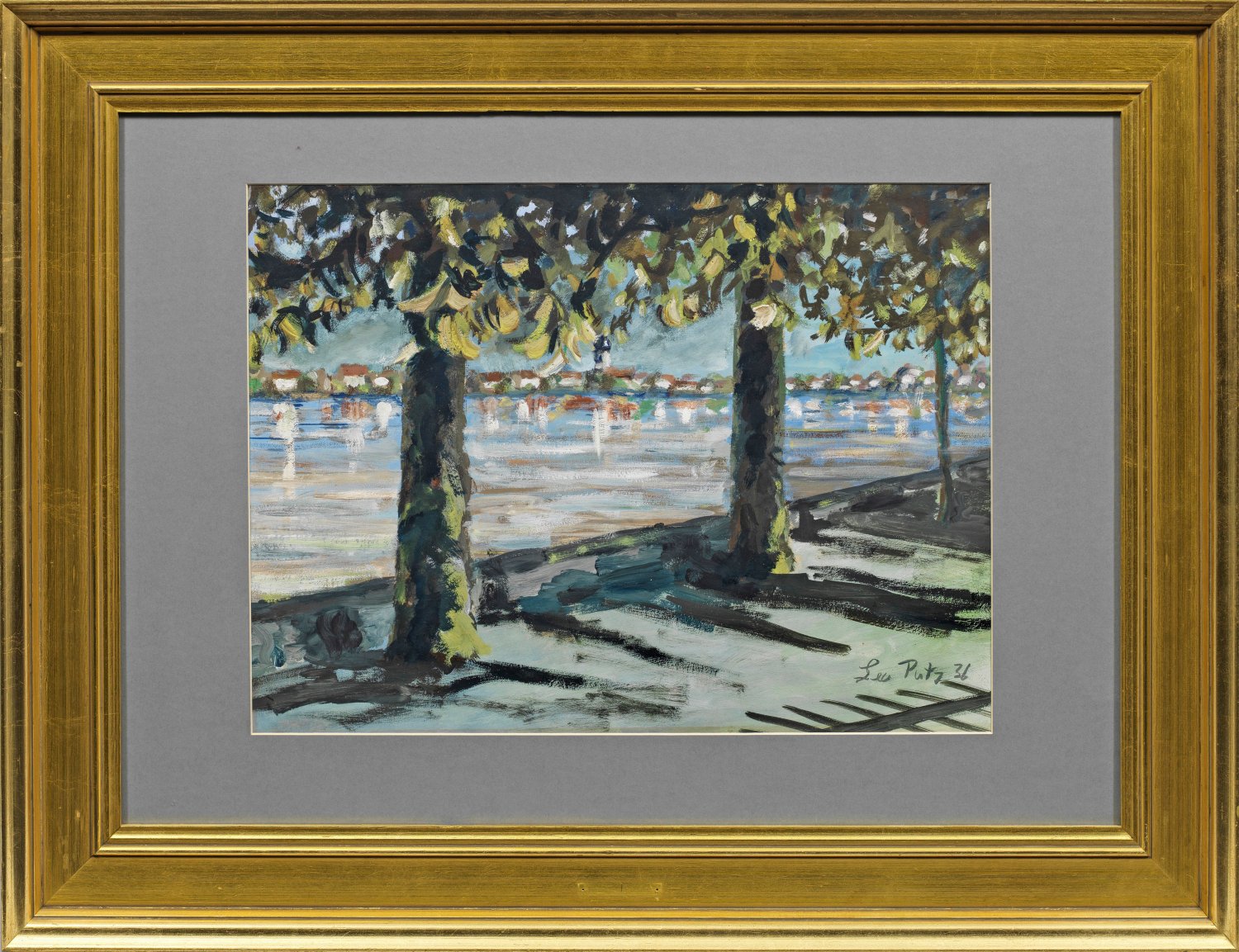 Mit virtuos gesetztem, schnellem, breitem Duktus ausgeführte, spätimpressionistische, lichtdurchflutete Impression des Starnberger Sees mit Blick durch die Bäume der Promenade auf ein am Ufer gelegenes Dorf, dessen Silhouette sich effektvoll flirrend in der Wasseroberfläche reflektiert. Spätes, reizvolles, vermutlich kurz vor seiner Rückkehr in seine Heimatstadt Meran entstandenes Blatt Putzs', dessen künstlerische Laufbahn 1889 an der Münchner Akademie begann und an der Académie Julian in Paris weitergeführt wurde. Ab 1897 in München ansässig, trat er im selben Jahr der Sezession bei. Von den neuen Tendenzen bewegt, wurde er 1899 Mitbegründer der fortschrittlichen Münchner Künstlervereinigung "Die Scholle". Mit der auf eine gesamtheitliche Darstellungsweise angelegten, auf Farbe und Rhythmus basierenden Bildwirkung, steht der Impressionist in der Reihe jener Künstler, welche die deutsche Kunst um 1900 erneuerten. Gouache/Papier. R. u. sign. und dat. (19)36. Passepartoutausschnitt 33,2 cm x 45,3 cm. Rahmen.