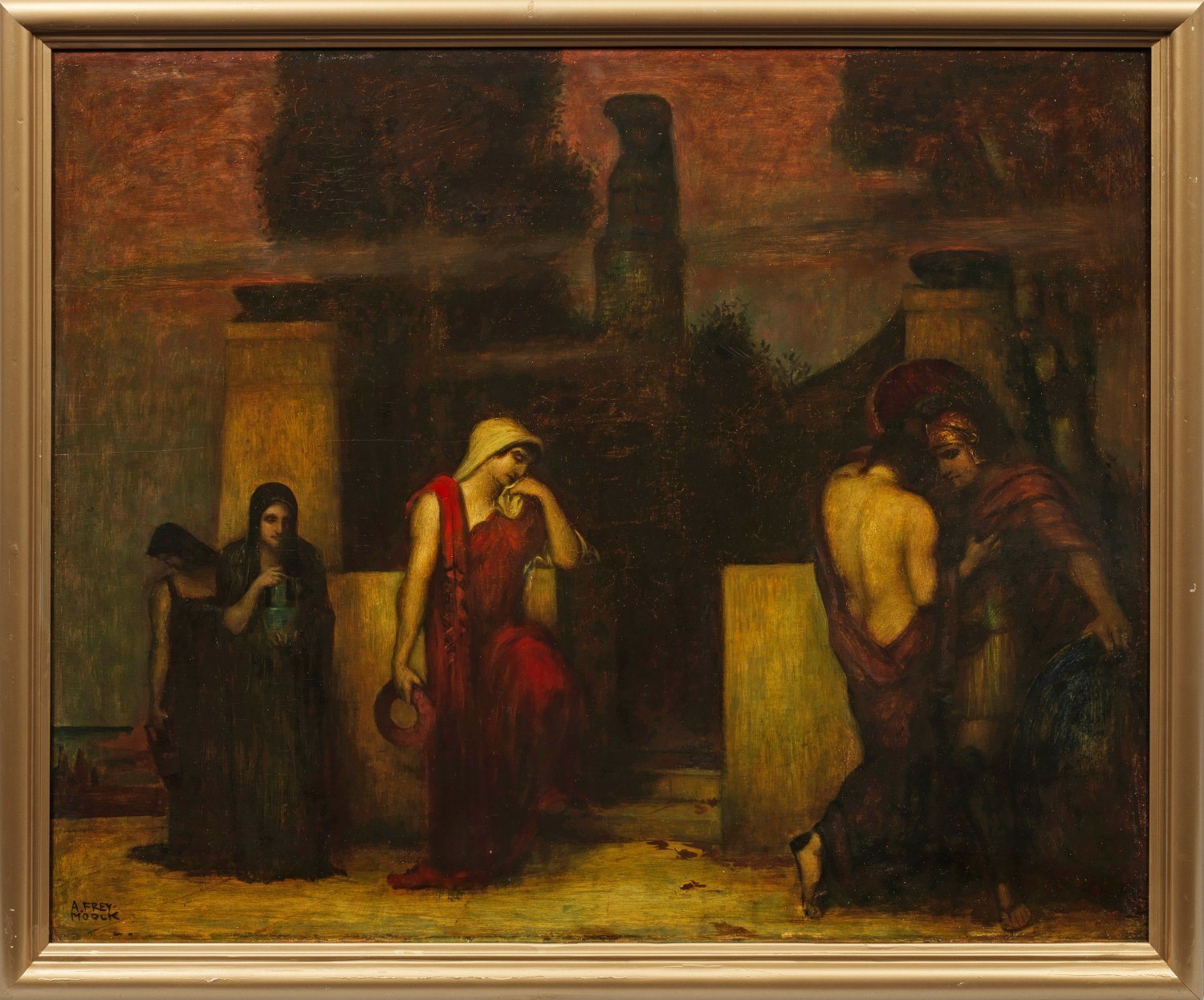Vor dem Eingang eines Tempels vier versammelte Frauen, die von einem Soldaten Abschied nehmen. Alle Anwesenden sind sichtlich bewegt und zeigen große Wehmut über den Abschied des geliebten Menschen. In toniger Palette gemalte und in Licht- und Schattenführung effektvoll inszenierte, charakteristische Szene des Schweizer Malers, der lange in Deutschland tätig war. Frey-Moock ging 1902 nach München, wo er ab 1904 an der Akademie bei Karl Raupp und Wilhelm von Diez studierte und später Assistent von Franz von Stuck wurde. In seinen Werken wurde er intensiv sowohl durch Stuck als auch von Böcklin beeinflusst. Öl/Sperrholztafel. L. u. sign.; 80,5 cm x 100,3 cm. Rahmen.