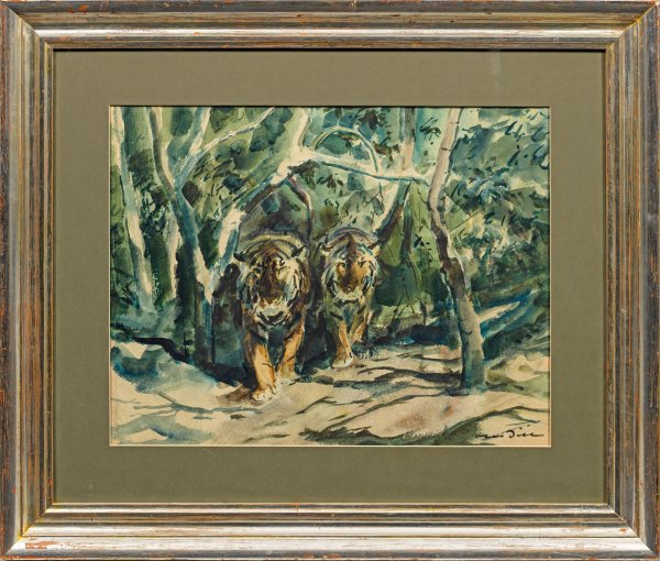 Schon seit seiner Kindheit faszinierten Dill insbesondere Raubkatzen, weshalb Tiger und Löwen neben Pferden und Reitern ein Hauptmotiv in seinem Oeuvre bilden. 1908-1914 studierte der Künstler an der Münchener Akademie und war dort Meisterschüler des Tiermalers Heinrich von Zügel. Bereits 1917 war er mit einer großen Kollektion von Gemälden und Zeichnungen im Glaspalast vertreten und stellte 1922-1930 als Mitglied in der Münchener Secession aus. Aquarell/Bütten. R. u. sign.; Passepartoutausschnitt 35,4 cm x 46,5 cm. Rahmen.