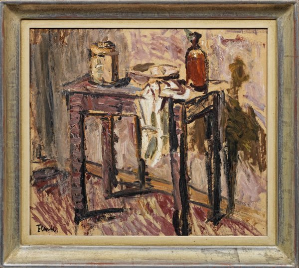 Mit breitem, furiosem Duktus gemaltes, um 1946 entstandenes Stillleben mit Flasche, Dose, Teller und Tuch, arrangiert auf einem Tisch. In Stil und Motiv charakteristisches, durch kräftige Schatten dominiertes Werk Flintes, der eine eminente Zahl an Stillleben schuf, die er meist auf einem Tisch inszenierte. Der Hamburger Künstler studierte 1901-1905 an der Stuttgarter Akademie in der Malklasse von Carlos Grethe und besuchte die Zeichenkurse von Robert Poetzelberger. Anschließend kehrte er als freischaffender Künstler in seine Heimatstadt zurück und wurde Mitglied der Hamburger Sezession. 1961 erhielt er den bekannten, durch die Hansestadt Hamburg verliehenen Edwin-Scharff-Preis. Öl/Malkarton. L. u. sign.; Verso auf einem Ausstellungsetikett bez. und betitelt. 46,5 cm x 53,7 cm. Rahmen.