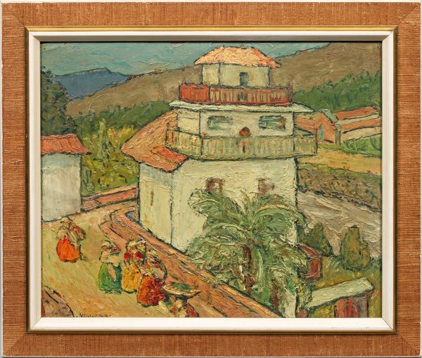 In tonigem, pastos aufgetragenem Kolorit und kontrastierenden Umrisslinien gemalte Ansicht, belebt durch einige Frauen in farbenfrohen Kleidern, vom Markt heimkehrend. Hans Michaelson, der zu den Künstlern der sog. "Verschollenen Generation" zählt, lernte bei Ludwig Schmid-Reutte in München und anschließend bei Friedrich Kallmorgen an der Berliner Akademie. Aufgrund seiner jüdischen Abstammung wurde er nach der Machtergreifung der Nationalsozialisten nicht nur mit einem Berufsverbot belegt, sondern musste aufgrund seiner jüdischen Herkunft um sein Leben fürchten. Somit sah er für sich und seine Ehefrau, die Malerin Else Henriette Angerstein (1881 - 1976), keinen anderen Ausweg als die Flucht aus Deutschland. 1939 emigrierten sie durch die Hilfe eines ecuadorianischen Botschafters und Kunstliebhabers nach Ecuador und ließen sich in Guayaquil nieder, wo Michaelson begann, an der ortsansässigen Kunstschule zu unterrichten und sich zusammen mit seiner Frau, aktiv in der dortigen Kunstszene einzubringen und nachhaltig Spuren zu hinterlassen. Öl/Karton. L. u. sign. Sichtmaß 42 cm x 51 cm. Rahmen.