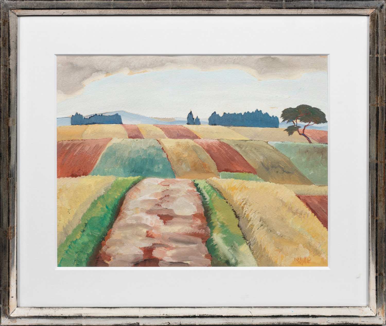 Flächig komponiertes Werk Nepos, der 1913/14 an der Wiener Kunstgewerbeschule bei Alfred Roller, Adolf Böhm und Oskar Strnad studierte. Nach dem I. Weltkrieg ging er nach Innsbruck, wo er sich schnell in das Kunstleben der Stadt integrierte und mit Rudolf Lehnert, Herbert Gurschner und Alphons Schnegg den "Mühlauer Kreis" bildete. 1925 gründete er mit Wilhelm Nicolaus Prachensky, Leo Sebastian Humer und anderen die Künstlergruppe "Die Waage", 1927 wurde er in die Wiener Secession aufgenommen. Anfangs von Egon Schiele und dem Expressionismus beeinflusst, wandte sich Nepo ab Mitte der 1920er Jahre zunehmend der Neuen Sachlichkeit zu. Gouache/Papier. R. u. sign. u. dat. 1934. Ca. 33 cm x 42,5 cm (Passepartoutausschnitt). Rahmen.