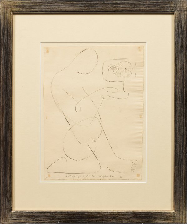 Kubistische Komposition Scheeles, der seit 1922 in Offenbach und Frankfurt bei Albert Windisch, Rudolf Koch und Franz Karl Delavilla studierte. 1927 ging er nach Berlin, wo er erste Ausstellungserfolge feierte und in den 1930er Jahren zur Abstraktion fand. 1937 wurden erste Werke Scheeles als "entartet" verfemt. Feder/Papier. R. o. sign. u. dat. (19)33. Unterhalb undeutl betitelt. Durchschlagende Montierungsspuren. Ca. 28 cm x 20 cm (Passepartoutausschnitt). Ca. 29,5 cm x 22 cm. Rahmen.