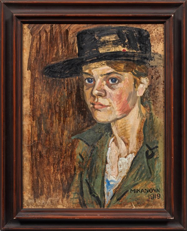 In erdigem Kolorit und lockerem Duktus gemaltes, sehr frühes Bildnis der Künstlerin, das zu einem der wenigen erhaltenen Werke vor 1945 gehört - bei einem Luftangriff am 14. Februar 1945 zerstörte eine Bombe ihr Atelierhaus in Prag mit fast allen Arbeiten. Marie Zlatníková-Mikanová studierte in Prag an der Kunstgewerbeschule und 1921-1927 an der Akademie. 1936 fand ihre erste Einzelausstellung "Kind in Zeichnungen und Skulpturen" in Prag statt. Öl/Papier, kaschiert auf Masonit. R. u. sign. und dat. 1919. 57,5 cm x 45 cm. Rahmen.