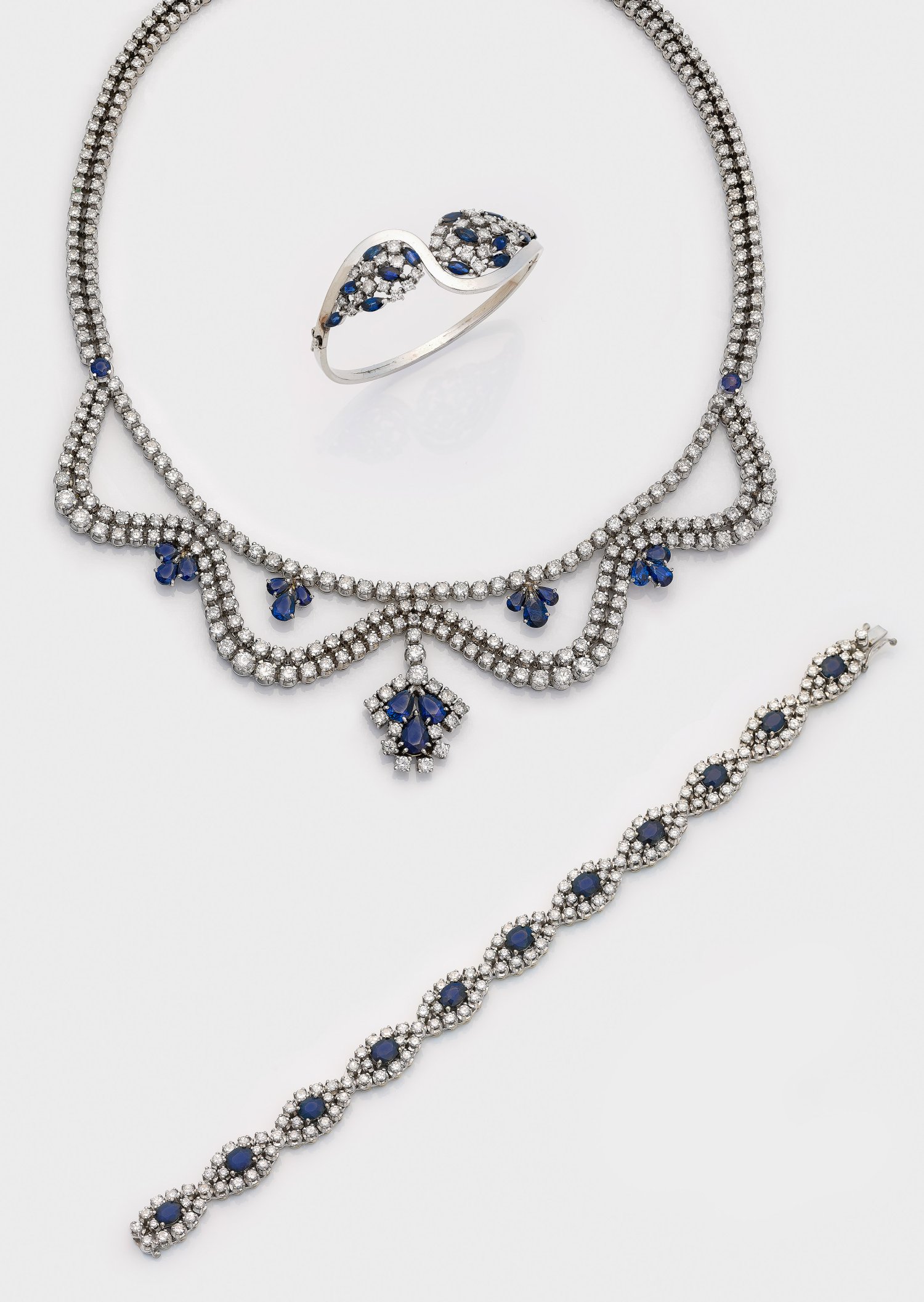 Collier, korrespondierendes Armband und Armreif. Weißgold, gest. 750. Schauseitig besetzt mit nahezu kornblumenblauen Saphiren von zus. ca. 10 ct. und Brillanten von zus. ca. 22 ct. (H-J/vs-si). Ges.-Gew. ca. 145,76 g.