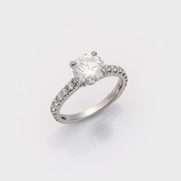 Ring set with a brilliant solitaire approx. 2,01 ct. (E/si1) and diamonds approx. 0,60 ct., in platinum. Certificate included.