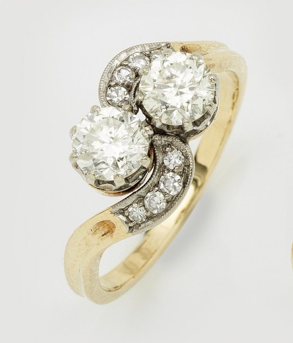 Gelbgold, gest. 585. Zentral besetzt mit 2 Altschliffdiamanten, entouriert mit Diamantbesatz von zus. ca. 1,00 ct.; Gew. ca. 3,72 g.