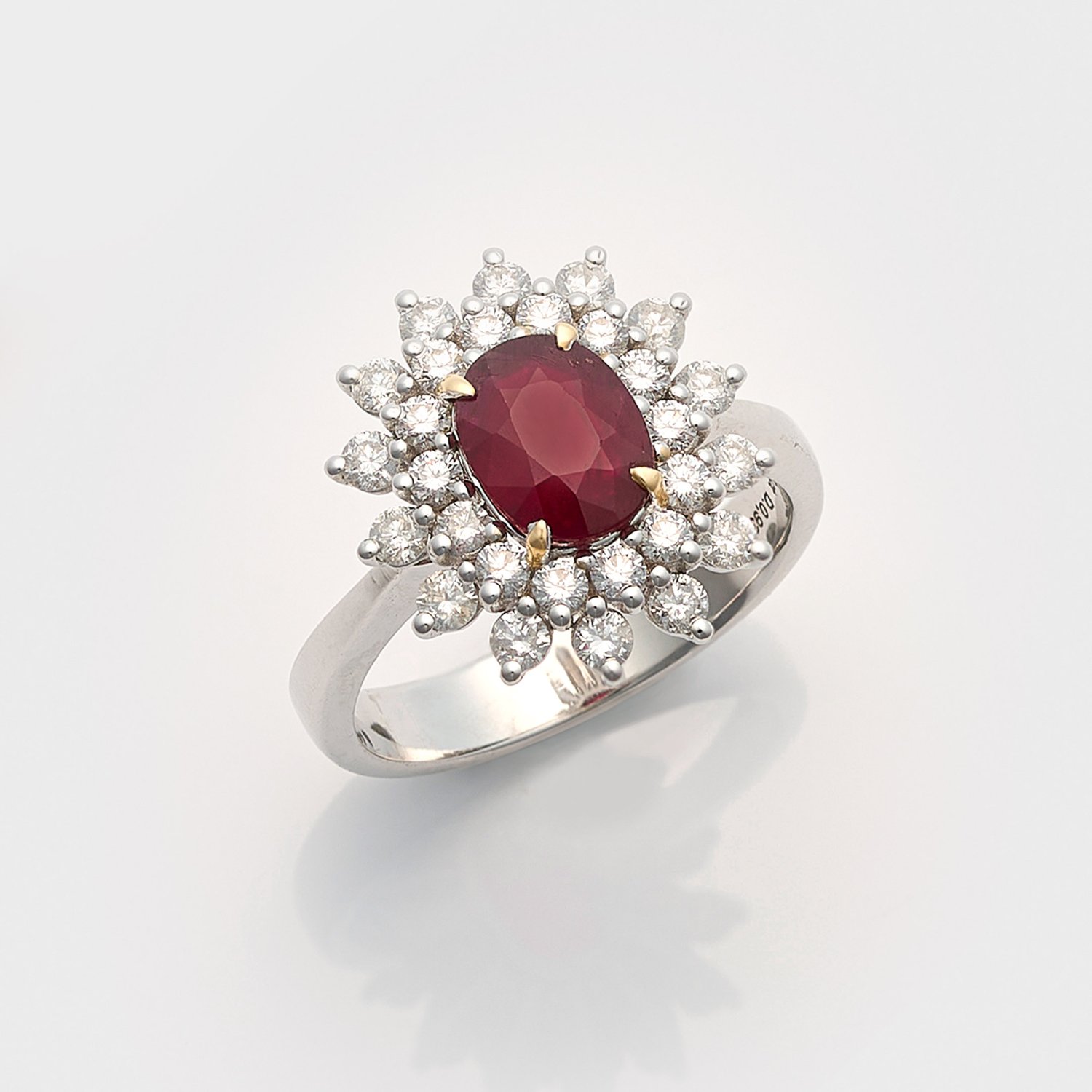 Weißgold, gest. 750. Zentral besetzt mit einem unbehandelten, taubenblutroten Rubin von ca. 1,91 ct., entouriert von Brillanten von zus. ca. 0,93 ct.; Gew. ca. 6,14 g.