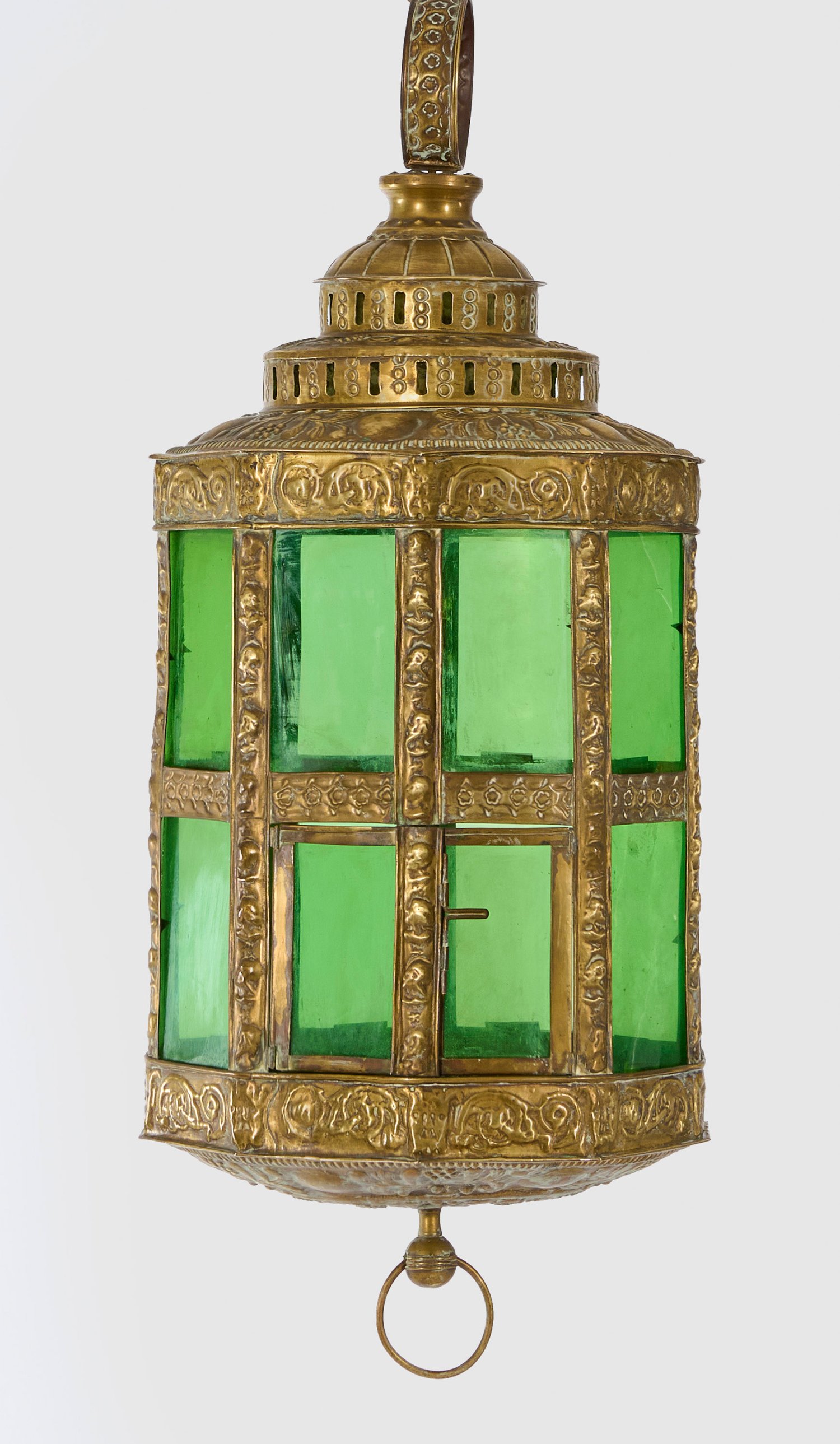Geprägtes Messingblech und grünes Glas. Gekanteter Korpus aus schmalen Streben und breiten Stegen mit Reliefdekor aus Volutenmotiven. Gestuft ansteigender, pagodenförmiger oberer Abschluss mit Ringbekrönung. Innen Stellfläche für Stumpenkerze. H. 87 cm. D. 37 cm.